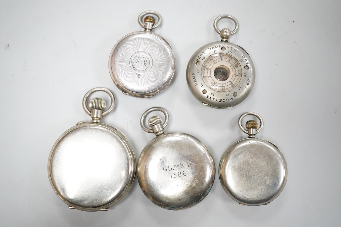 A collection of open faced pocket keyless watches to include a black faced Military pocket watch signed Carley & Clemence A1386, stamped verso GS MK. D 1386another black faced pocket watch, a silver open faced pocket watch and a Beck’s Damp Detector and Hygrometer.