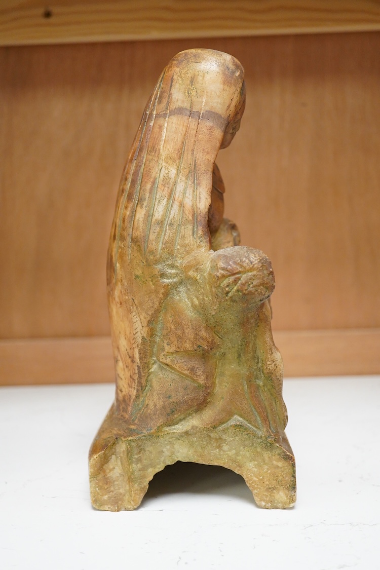 A carved alabaster figure, V. Dolorata, the Virgin Mary with Christ, height 24cm, base 13cm x 11cm,