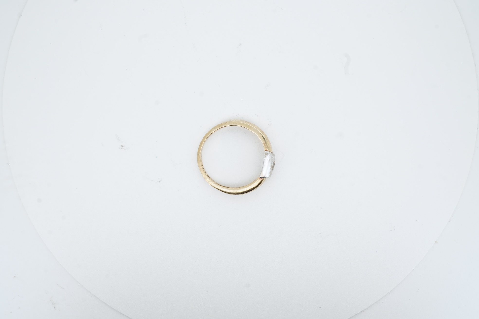 A diamond ring, rubover-set with a circular-cut diamond weighing approximately 0.10 carats, mounted in bicoloured 9ct gold, size O, British hallmarks, gross weight approximately 2.5 grams