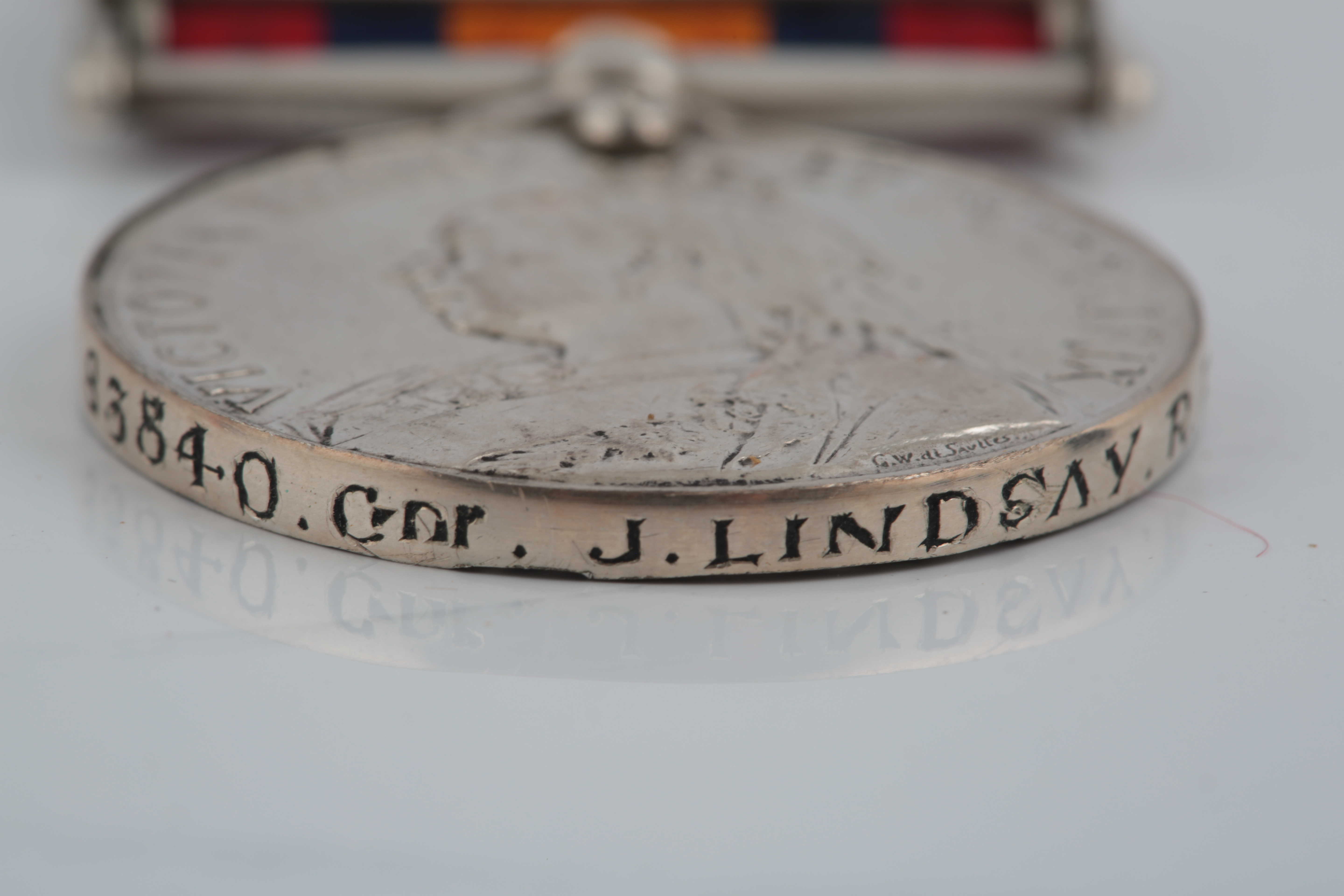 Five Victoria and Edward VII medals; a South Africa medal pair awarded to 83840. GNR. J. Lindsay. R.F.A.; comprising of a Queen’s South Africa medal with clasps for Orange Free State, South Africa 1902, Cape Colony, and Transvaal, and a King’s South Africa medal with clasps for South Africa 1901 and South Africa 1902, (both renamed)