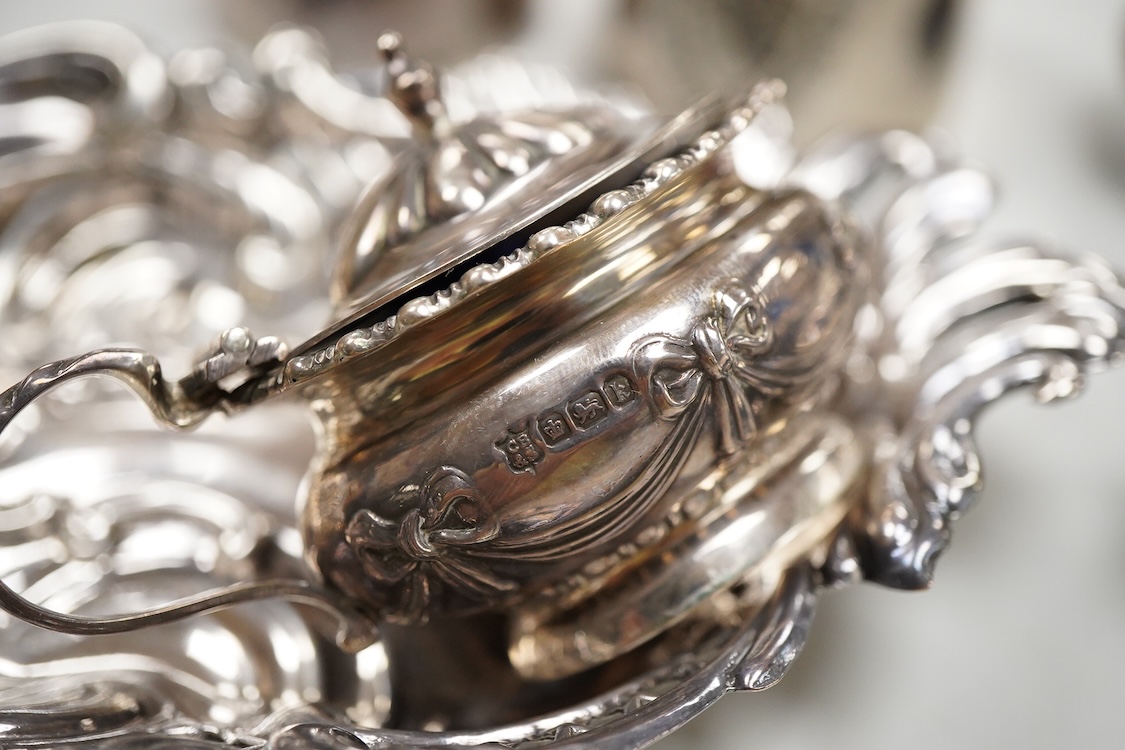 A pair of late Victorian shaped silver bonbon dishes, Walker & Hall, Birmingham, 1897, 16.5cm, together with an Edwardian silver mustard pot, a George V silver pepperette, a pair of sterling small condiments, an 800 stan