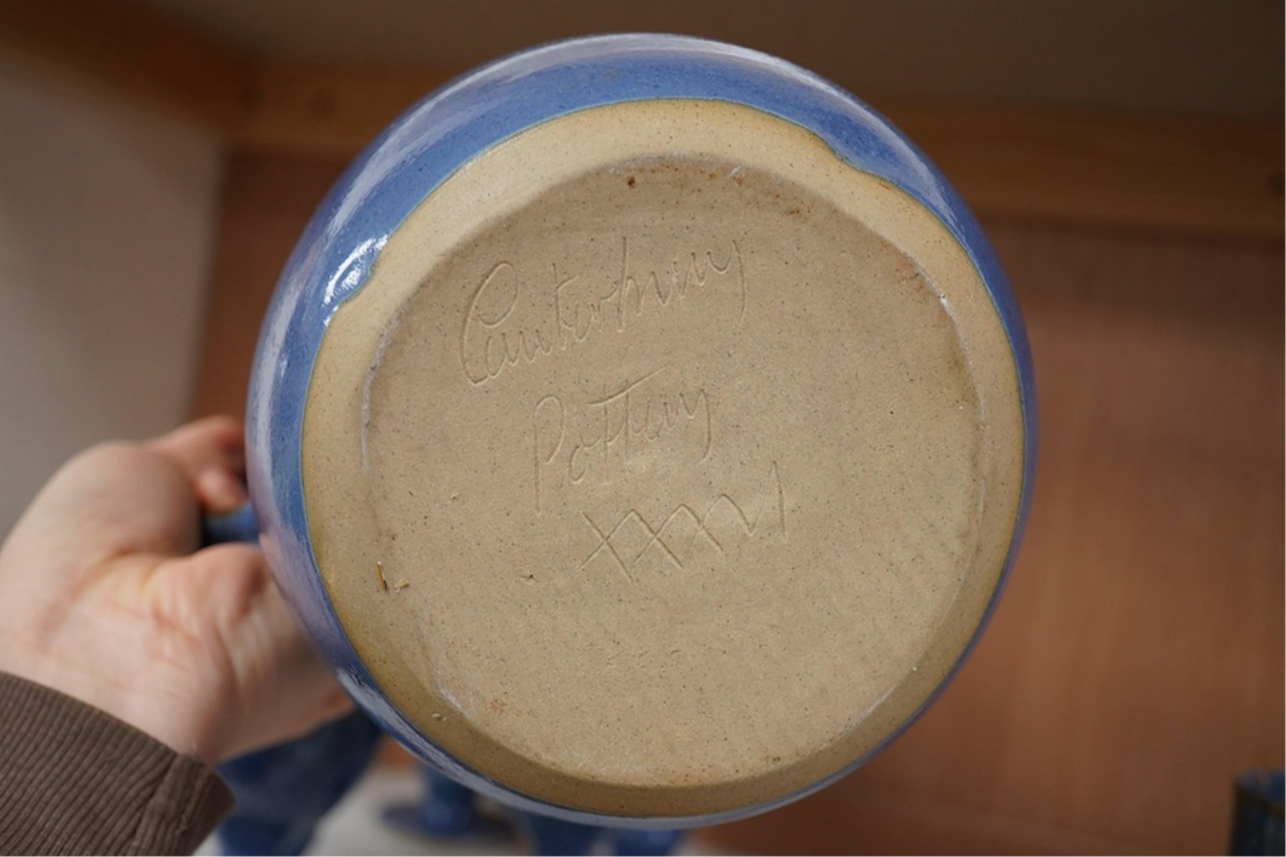 Lot 1108 , A Canterbury pottery, blue glaze jug and twelve goblets, jug 28cm high