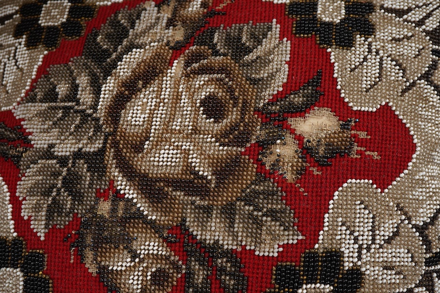 Lot 1405 , A 19th century Berlin bead worked cushion, the beadwork embroidered as a central rose, surrounded by an ornate tasseled swag, on a red wool worked background, 43cm x 45cm.