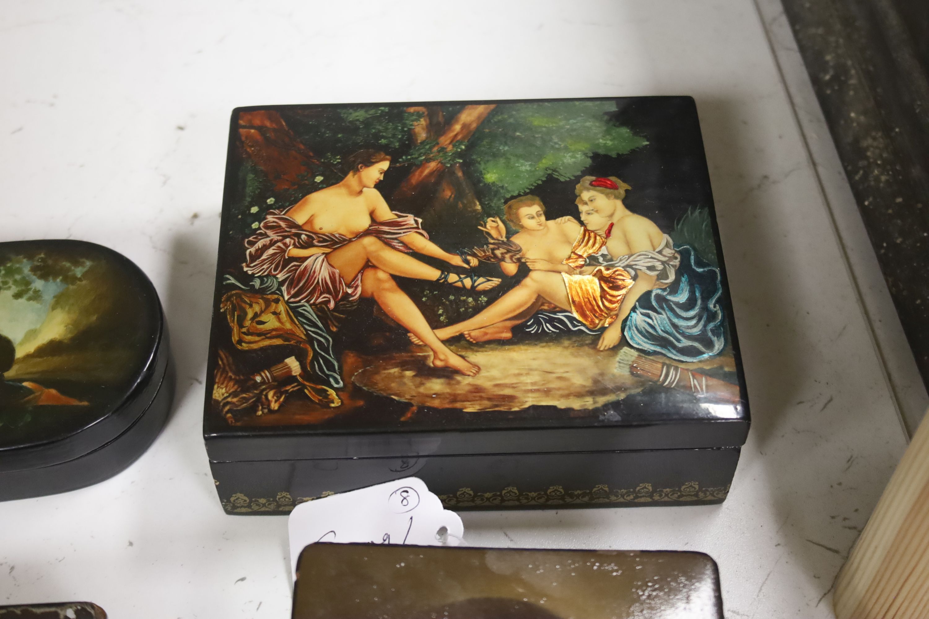 Seven Russian Papier mache boxes, 19th/20th century, large is 16.5 cm wide, with various painted scenes and a portrait miniature