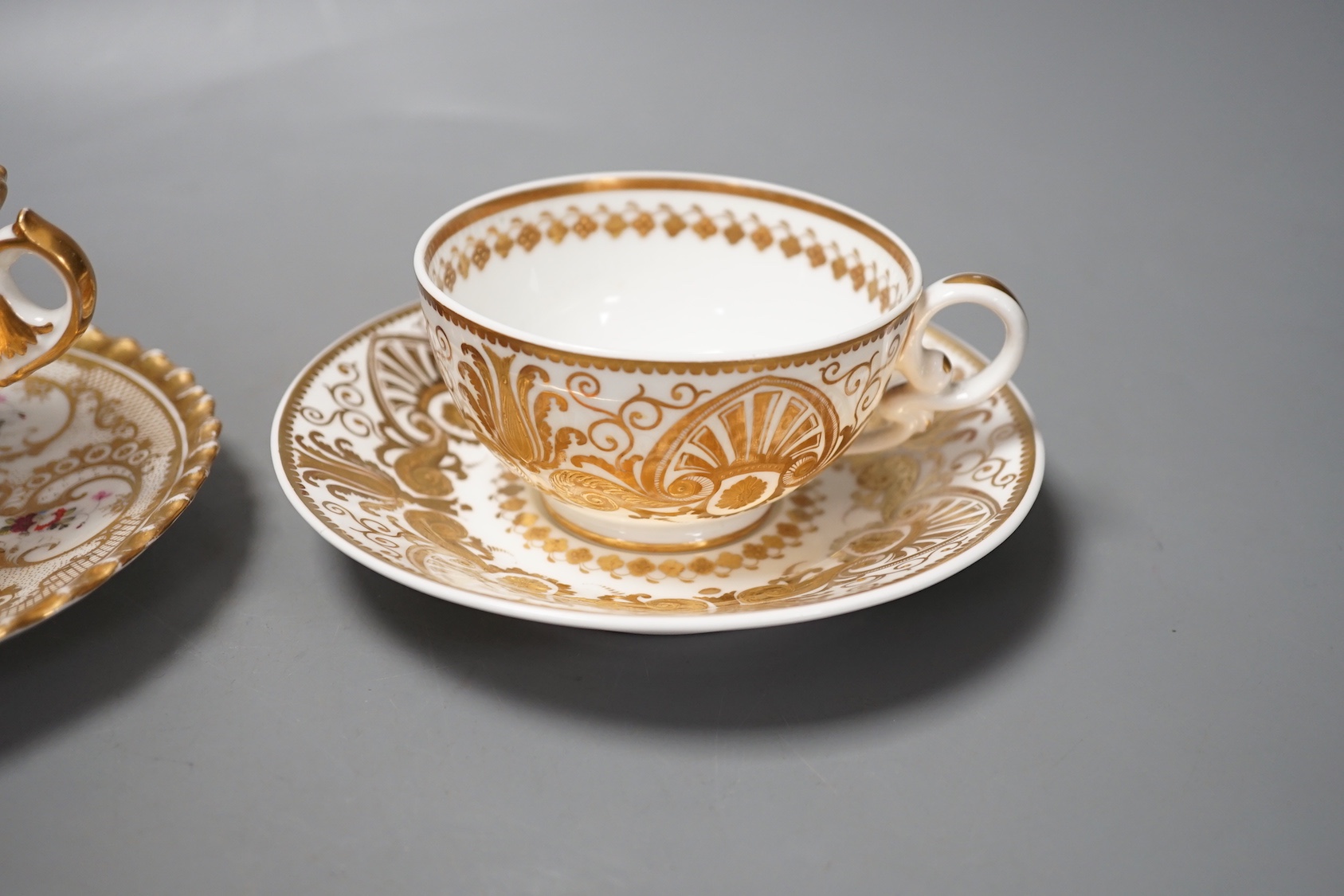 Lot 1362 , A Chamberlains Worcester gadroon bordered coffee cup and saucer painted with flowers, printed mark in puce and a Spode teacup and saucer with raised gilding in neo-classical style pattern 4327, mark and pattern in red