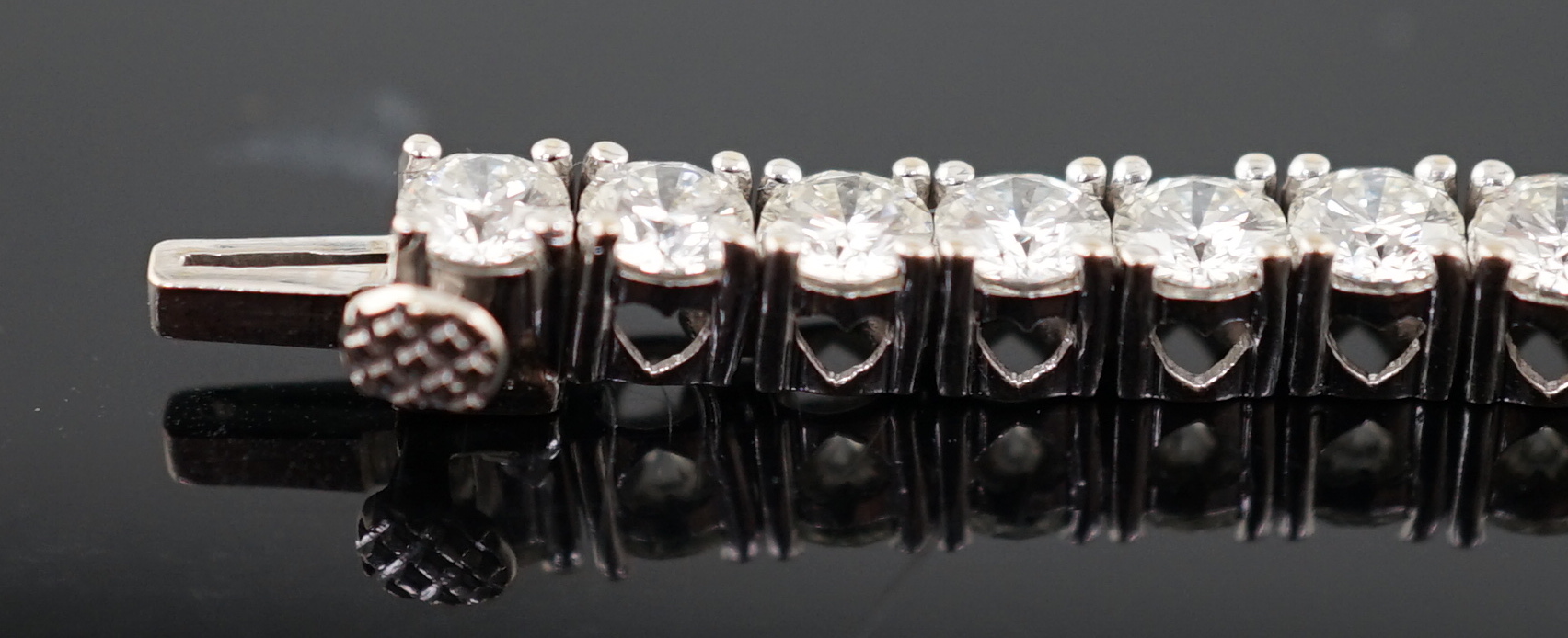 An 18k white gold and diamond line bracelet, set with forty eight round brilliant cut stones with an estimated total diamond weight of approximately 8.00ct. with an estimated colour and clarity range of I/J/K and VS2/SI1, 18cm, gross weight 15.8 grams.