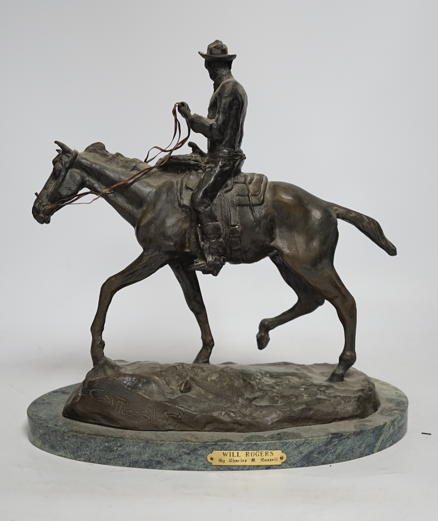 Lot 2388 , After Charles Marian Russell, a bronze group of Will Rogers, 29cm high