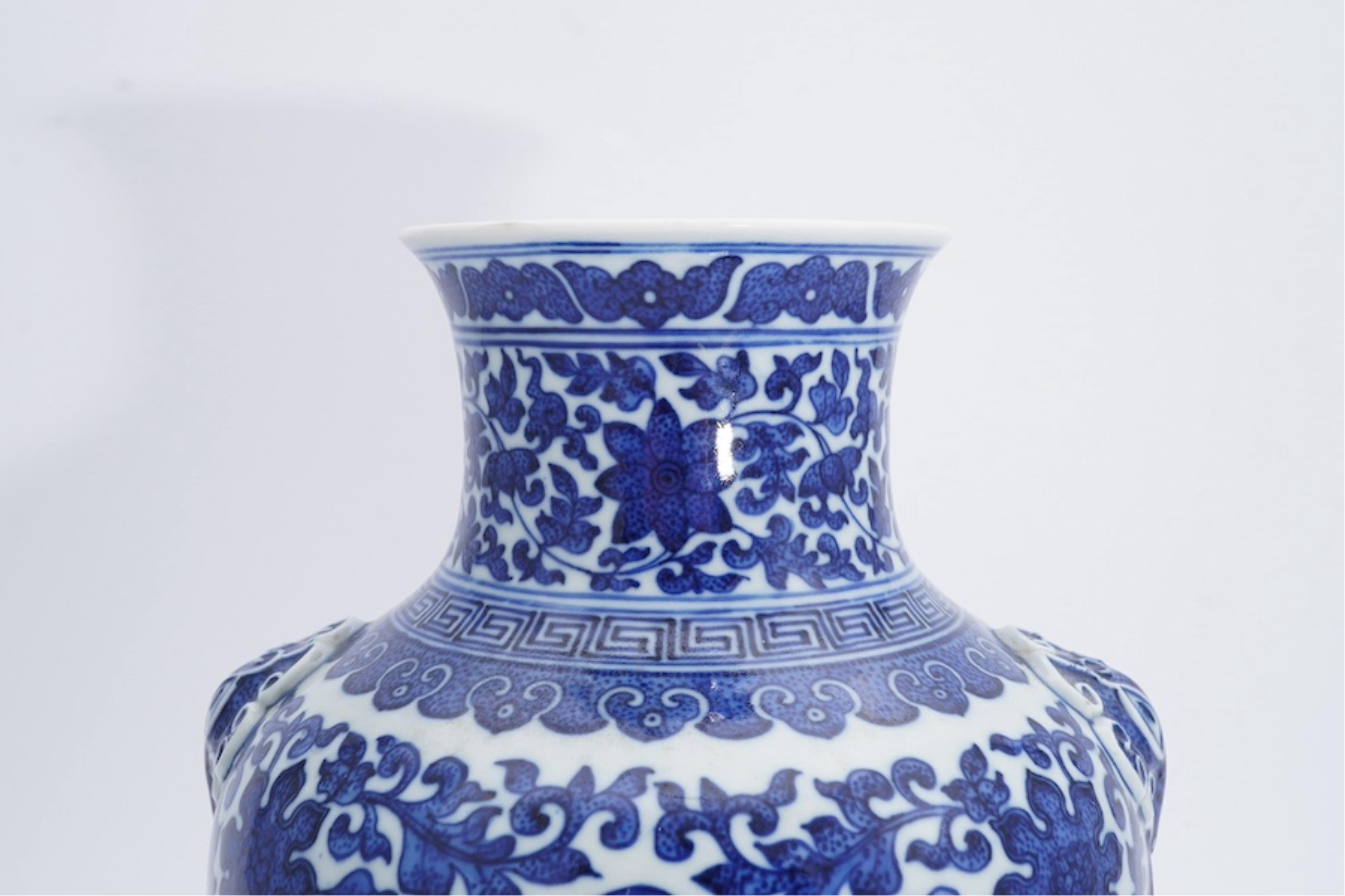 Lot 368 , A Chinese blue and white 'peaches' vase, Qianlong mark but later, 27cm high. Condition - good