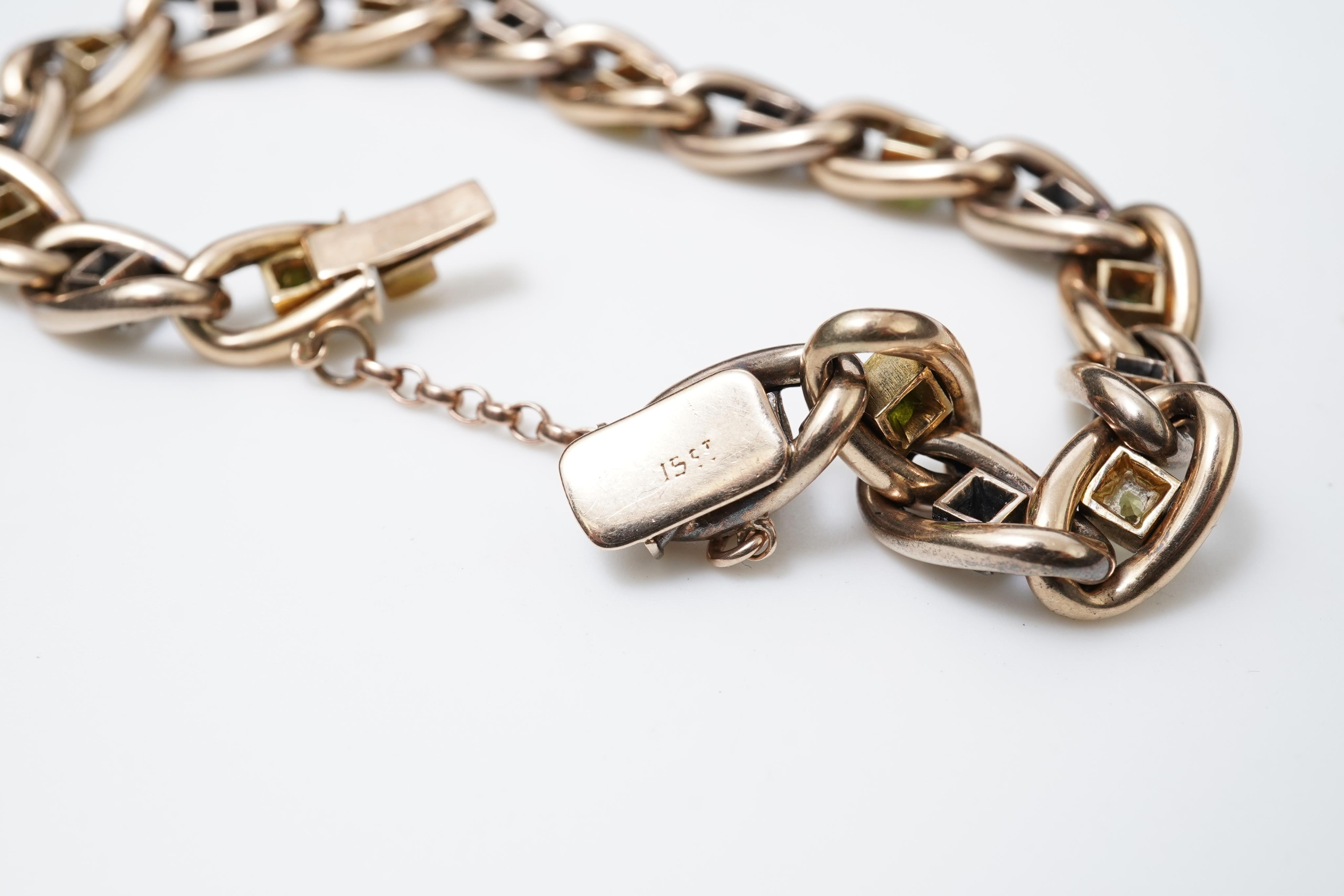 A demantoid garnet and diamond bracelet, early 20th century, composed of curb linking, each link centred on circular-cut diamonds and demantoid garnets in alternation, length approximately 18cm, stamped 15ct