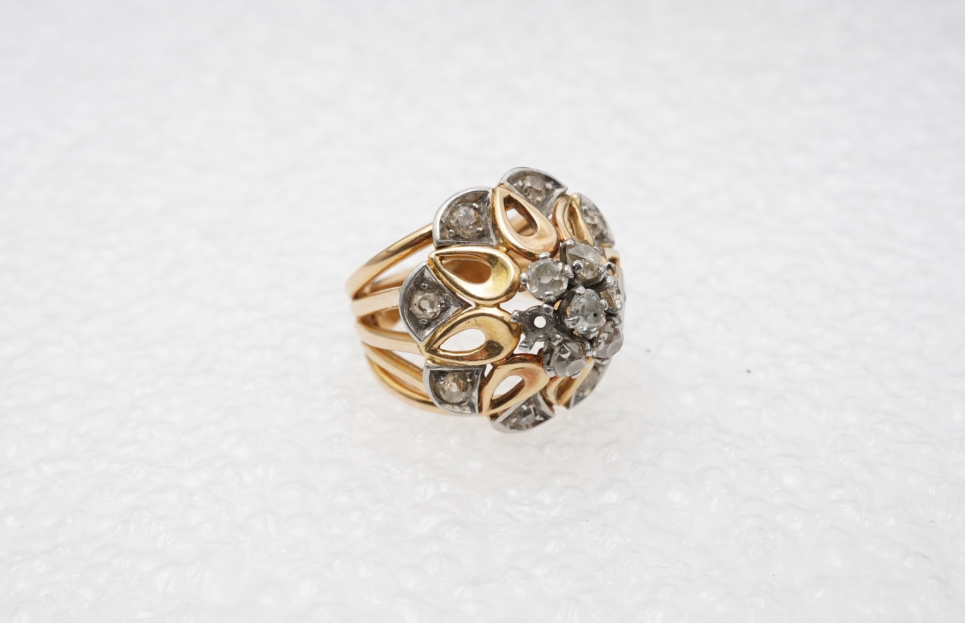 An attractive diamond dress ring, France, mid 20th century, designed as an openwork flower set with cushion-shaped diamonds totalling approximately 1.00 carat, mounted in gold and platinum, French assay marks for 18ct gold and platinum, indistinct French maker's mark, one diamond deficient