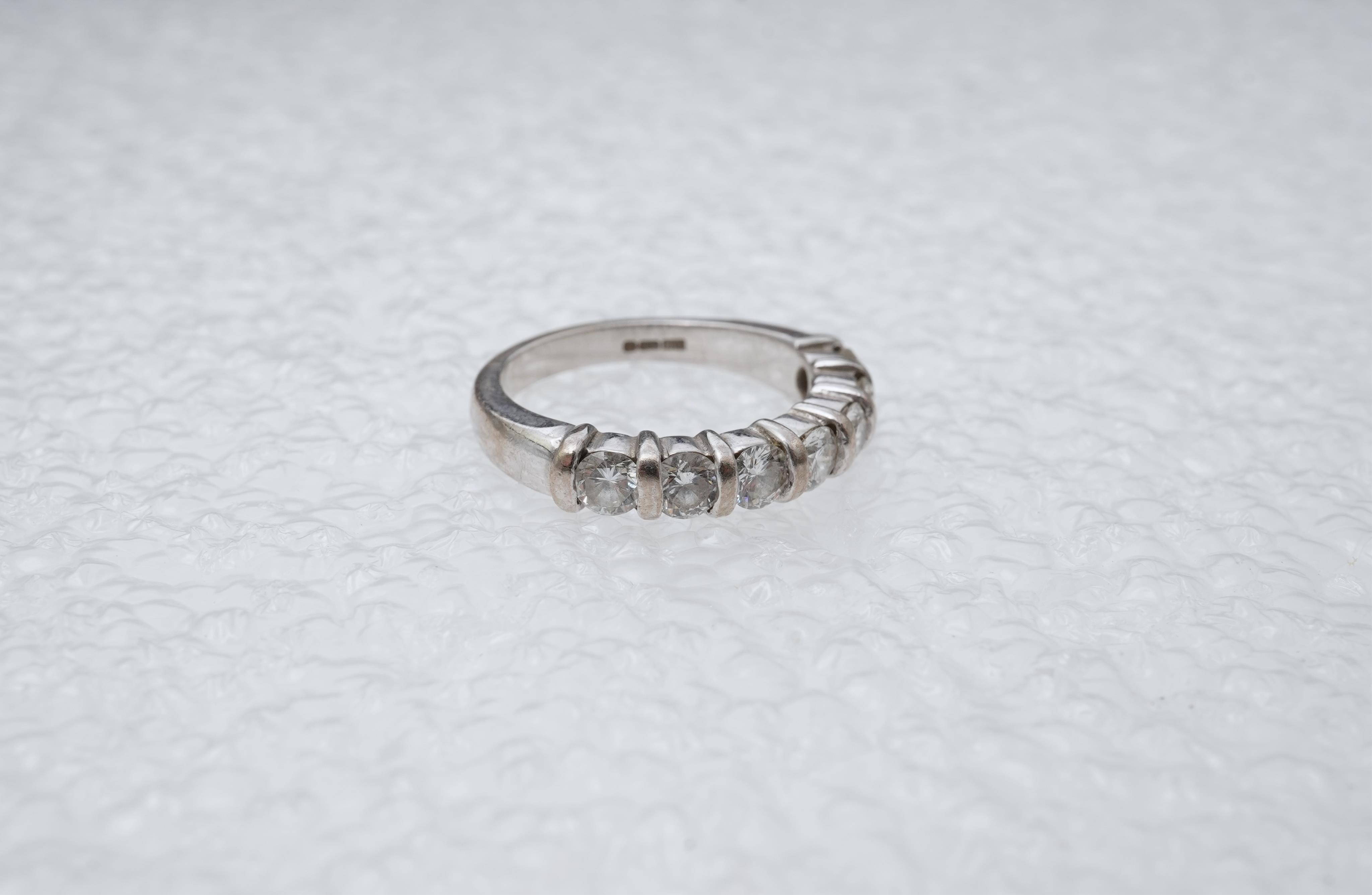 A seven-stone diamond ring, tension-set with seven brilliant-cut diamonds totalling approximately 0.80 carats, mounted in 18ct white gold, size J1/2, British hallmarks, gross weight approximately 4.5 grams