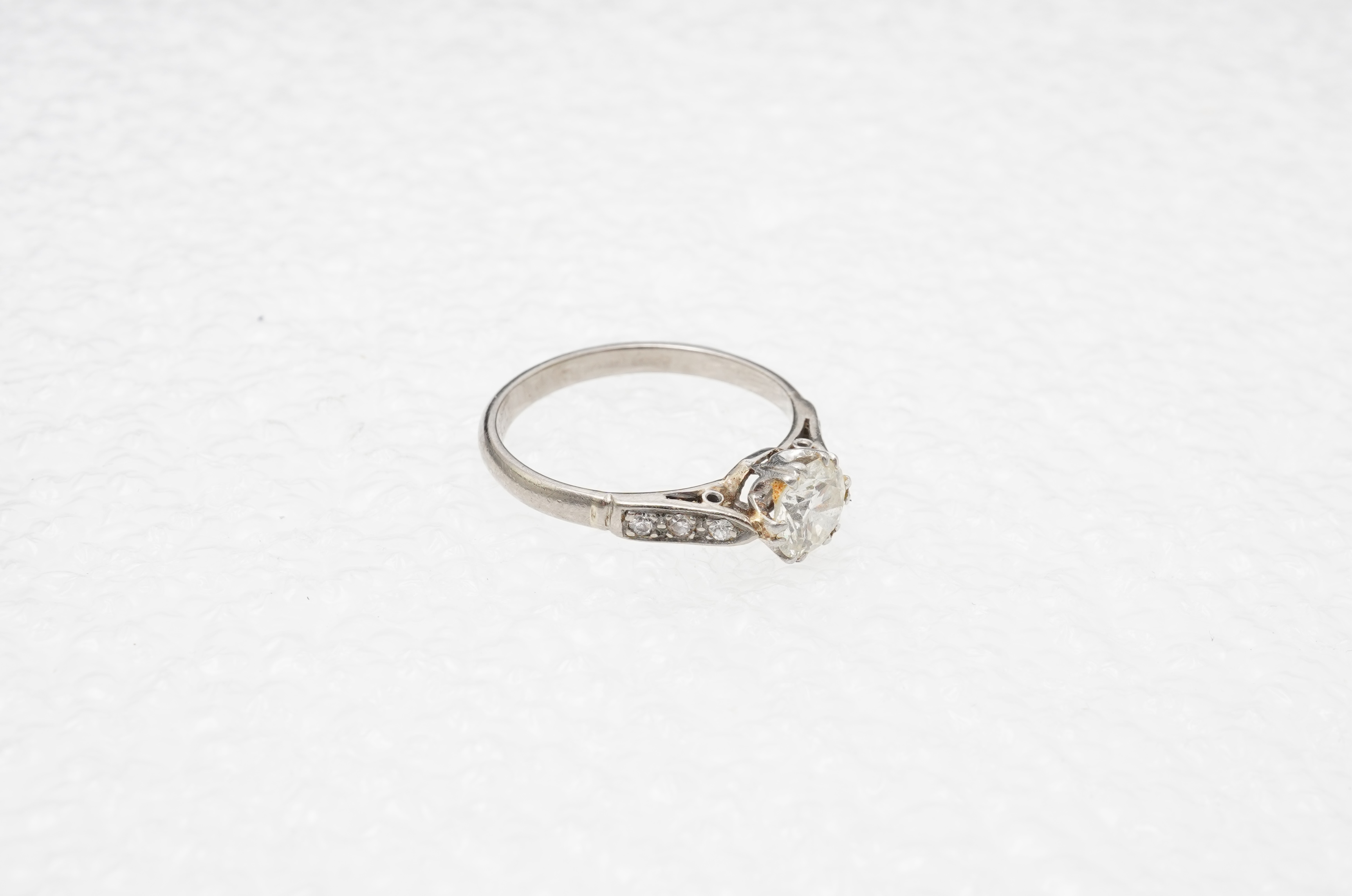 Central diamond approximately J/K colour, VS clarity. Mount in good condition, shank likely replaced. Not marked, mounted in white gold or platinum. Gross weight approximately 3 grams.