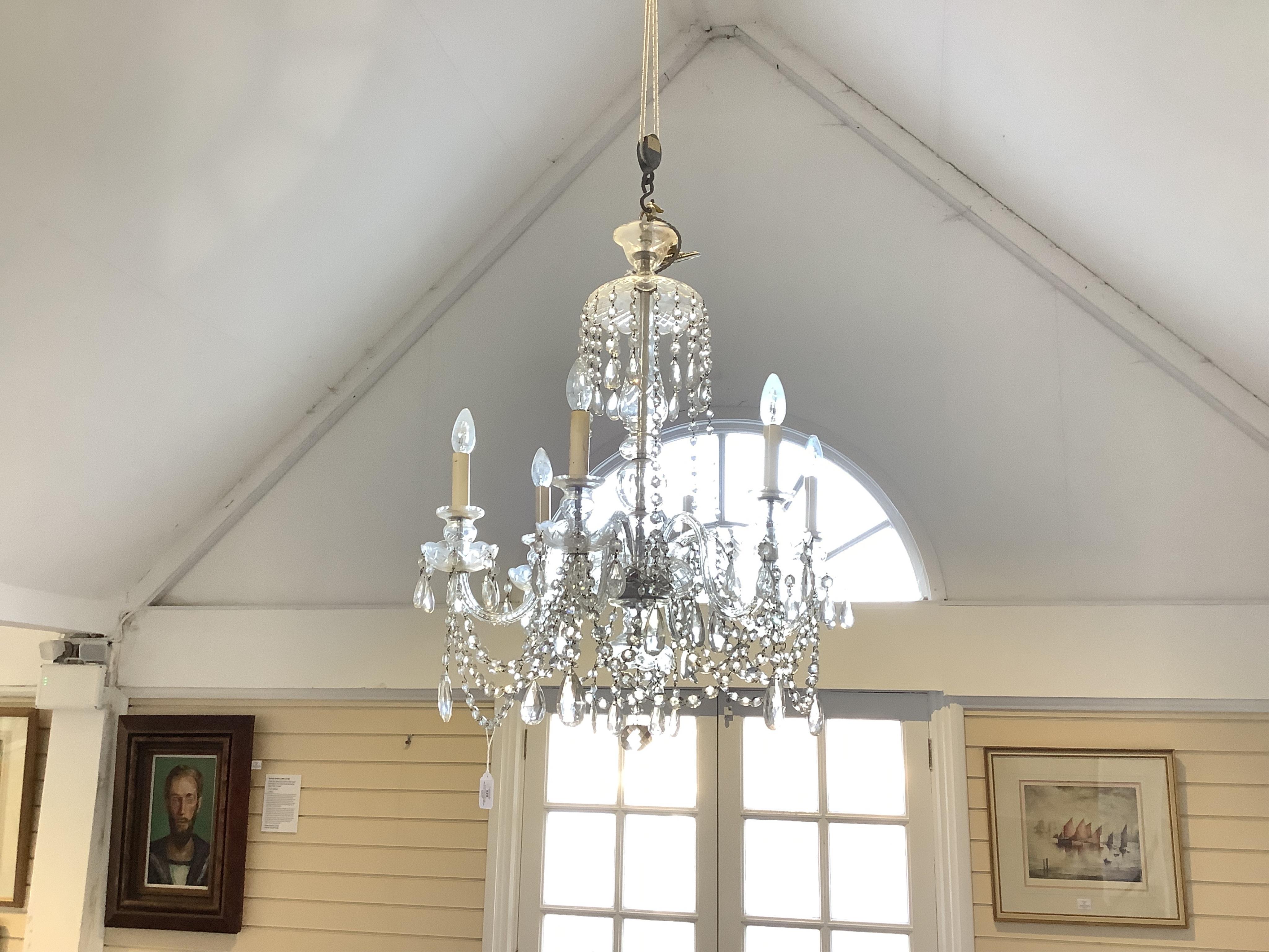 A cut glass five branch chandelier with drops
