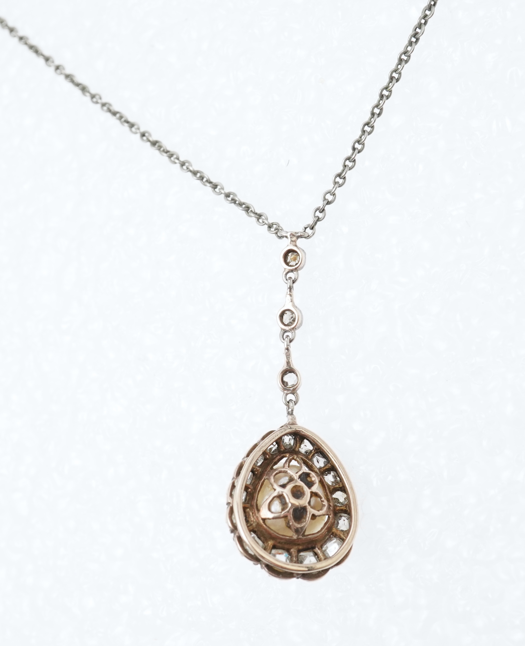 A pearl and diamond pendant, circa 1900, of drop-shaped outline, centring on a pearl measuring approximately 9 x 7.5mm, within a border of cushion-shaped diamonds totalling approximately 0.60 carats, suspended from rose-cut diamond links spaced by sections of knife wire, to a chain necklace, mounted in silver and gold, pendant length 3.5cm, chain length 42cm, clasp set with pastes, pearl untested