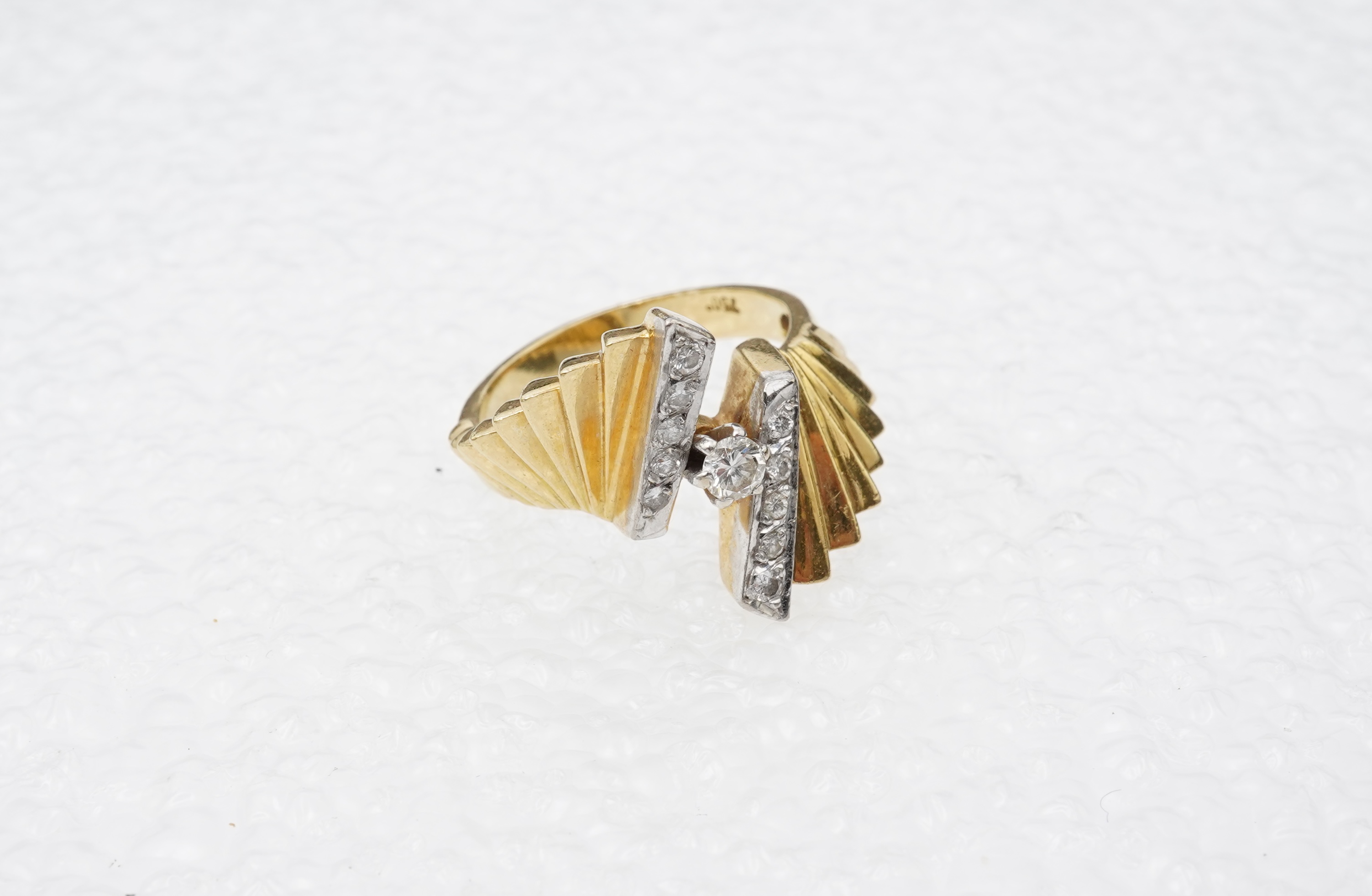 A gold and diamond dress ring, of asymmetrical, stepped design, accented with brilliant-cut diamonds totalling approximately 0.30 carats, size M, stamped 750, gross weight approximately 6.5 grams