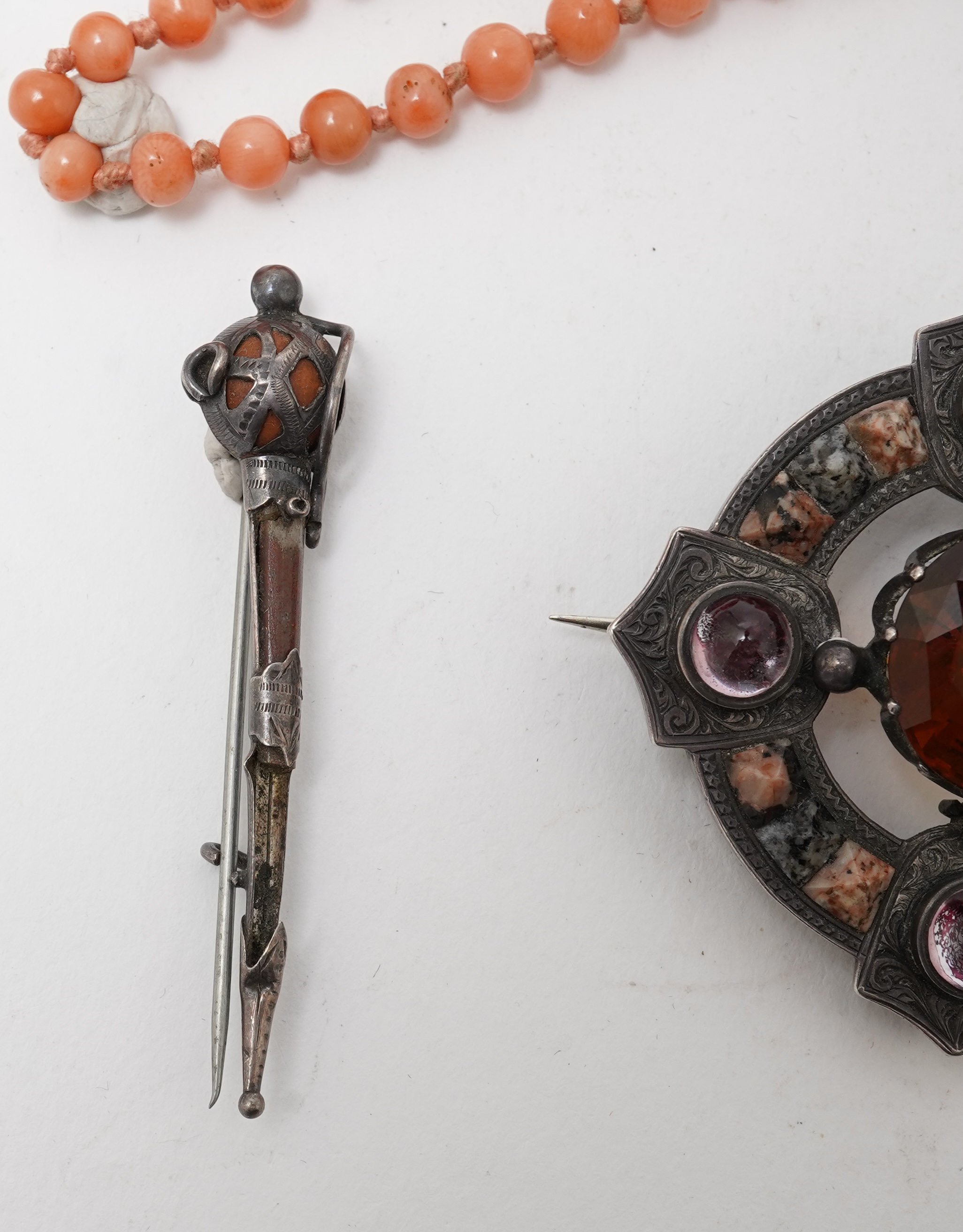 A collection of jewels including a coral necklace, comprising: a coral bead necklace, beads 4.5-8mm, length 38cm; two tortoiseshell piqué work brooches, two Scottish hardstone brooches; a Scottish brooch set with an oval citrine; a silver brooch modelled as a fish; a shell cameo brooch depicting a Muse; an amber cabochon brooch, length 3.8cm; and a hairwork brooch in rolled gold, length 5cm