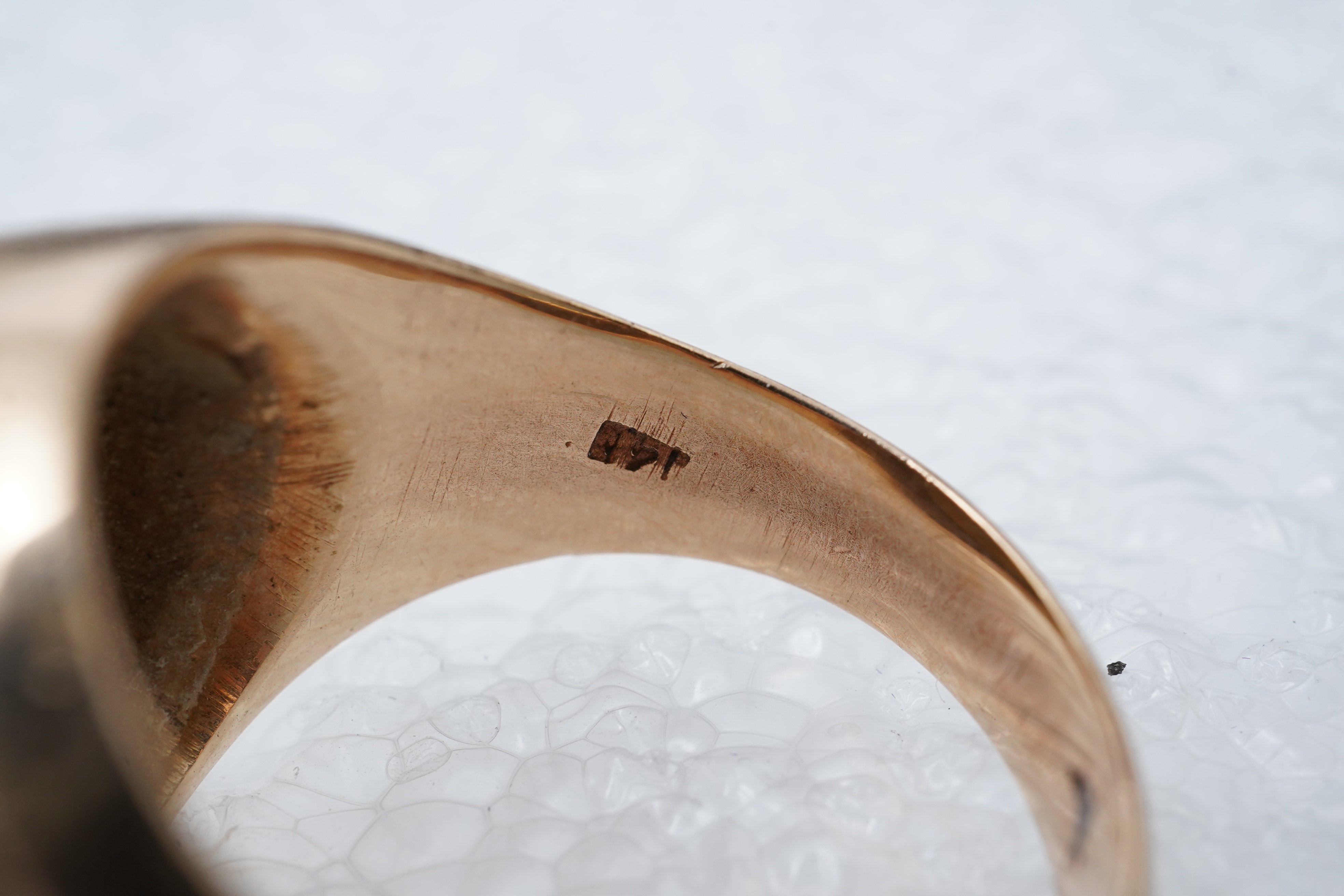 A tiger's eye dress ring, 1970s, collet-set with a cabochon cat's eye, to a plain gold mount, size O1/2, stamped 14K, gross weight approximately 9.5 grams