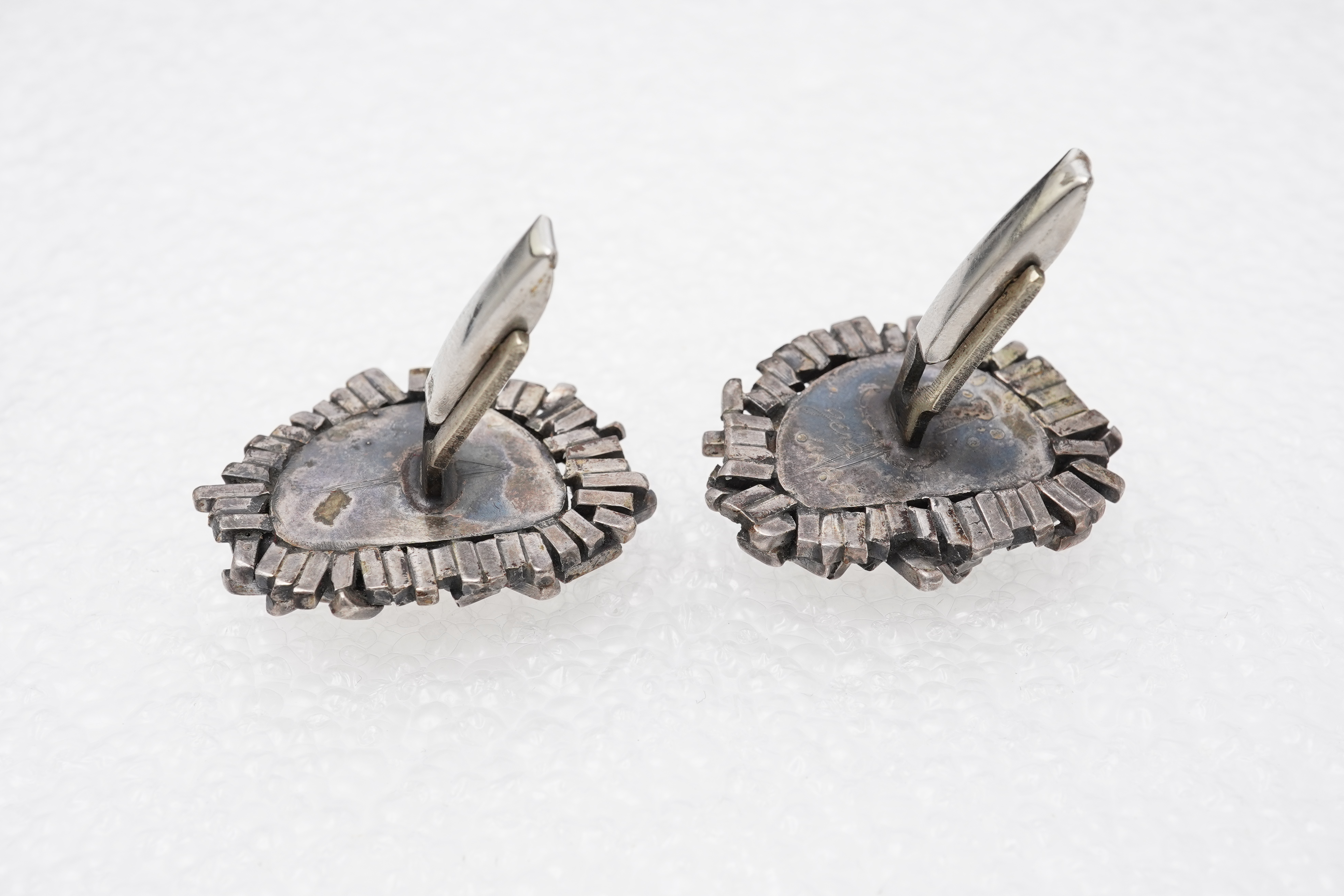 Attributed to Rachel Gera (1936-2023), a pair of mother of pearl cufflinks, Israel, 1970s, each set with an amorphous cabochon of mother of pearl, within an abstract textured border of silver, length 3.2cm each, one signed Gera Israel