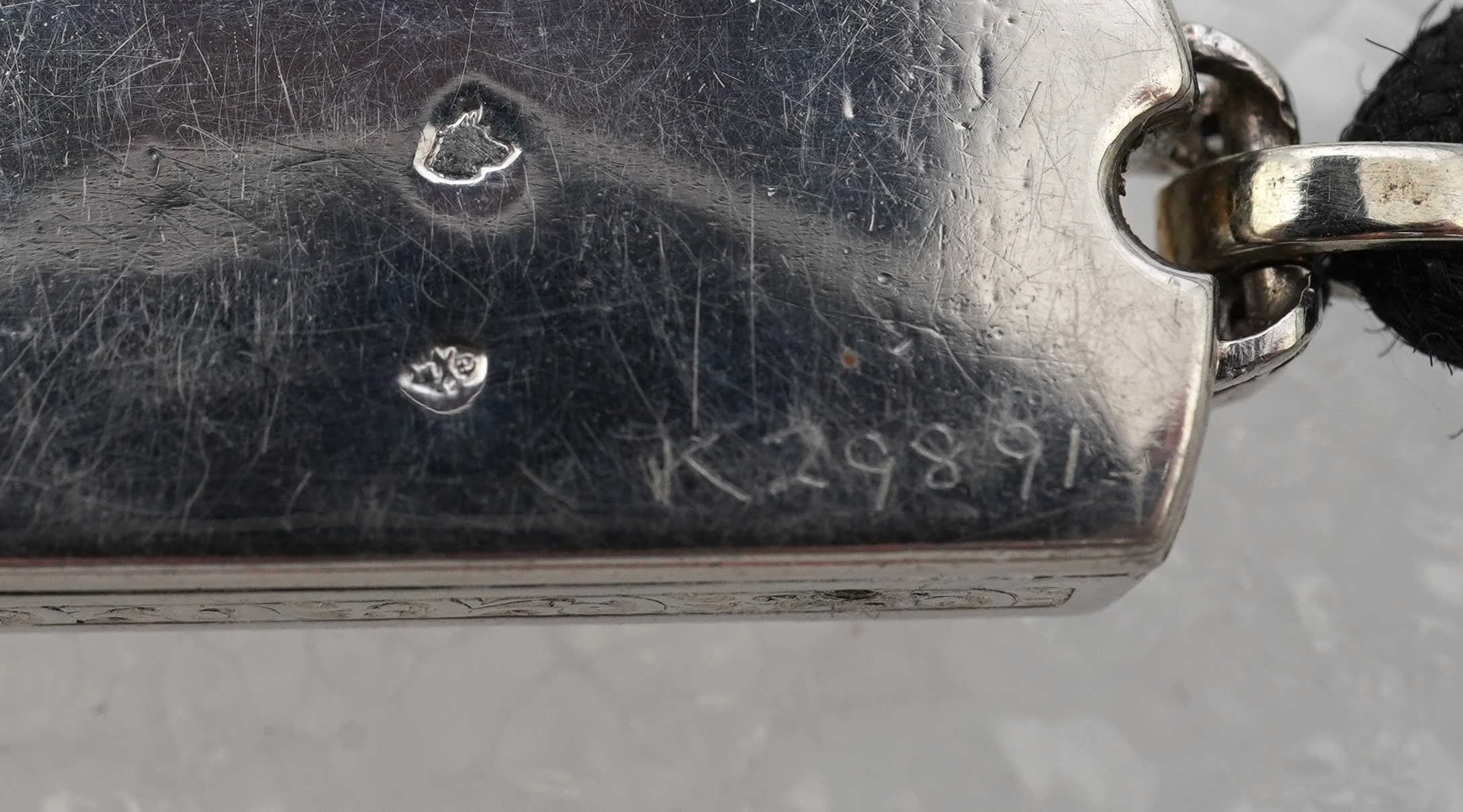 An Art Deco onyx and diamond cocktail watch, France, circa 1920, the silvered dial with Arabic numerals and blue steel hands, to a case of geometric design set with circular-cut diamonds and panels of onyx, to a black cord strap, case width 1.1cm, bracelet length 13cm, manual winding movement numbered 35448, case back numbered 10885, case with French assay marks for platinum, and maker's mark GM with crossed hammers, interior with French assay mark for 18ct gold