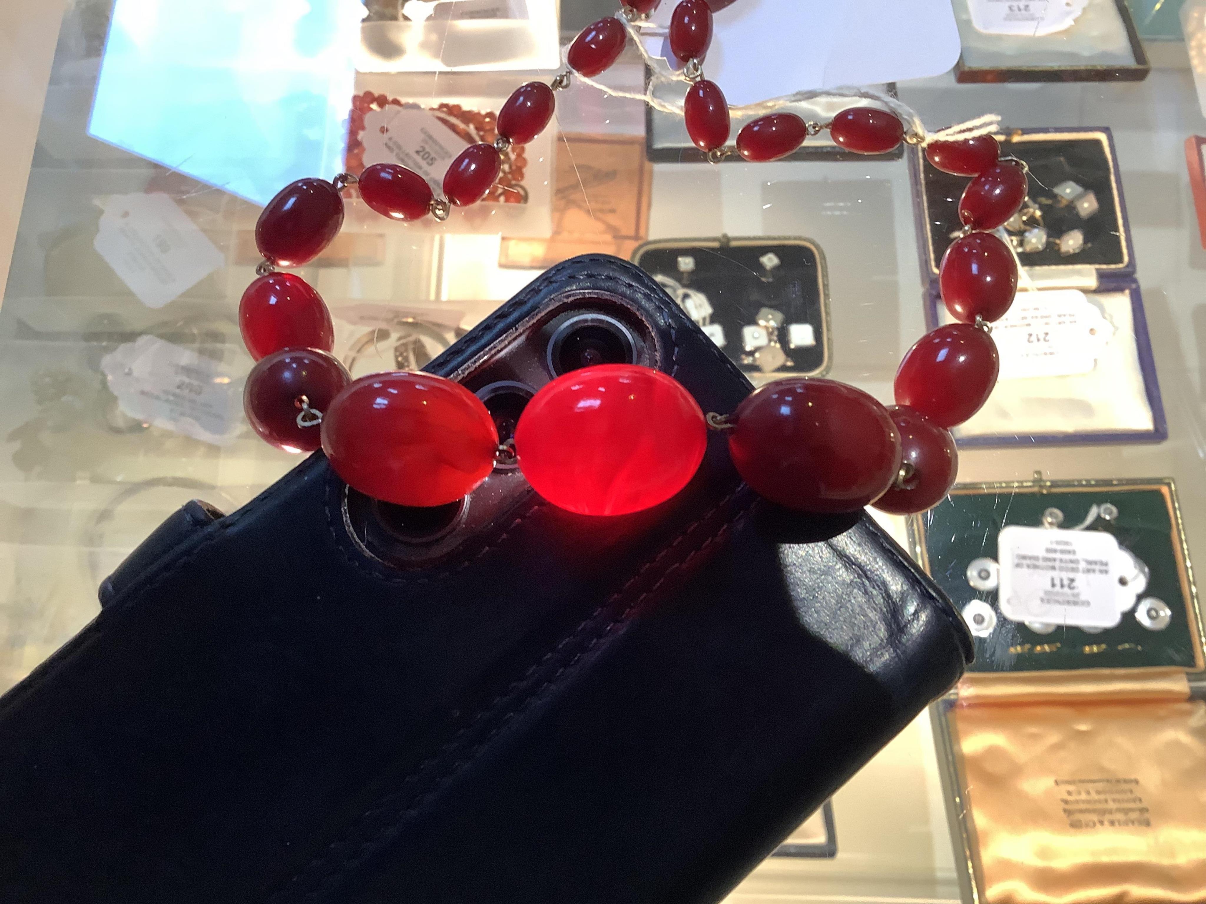 Lot 193 , A cherry-coloured bakelite imitation amber necklace and a glass bead necklace