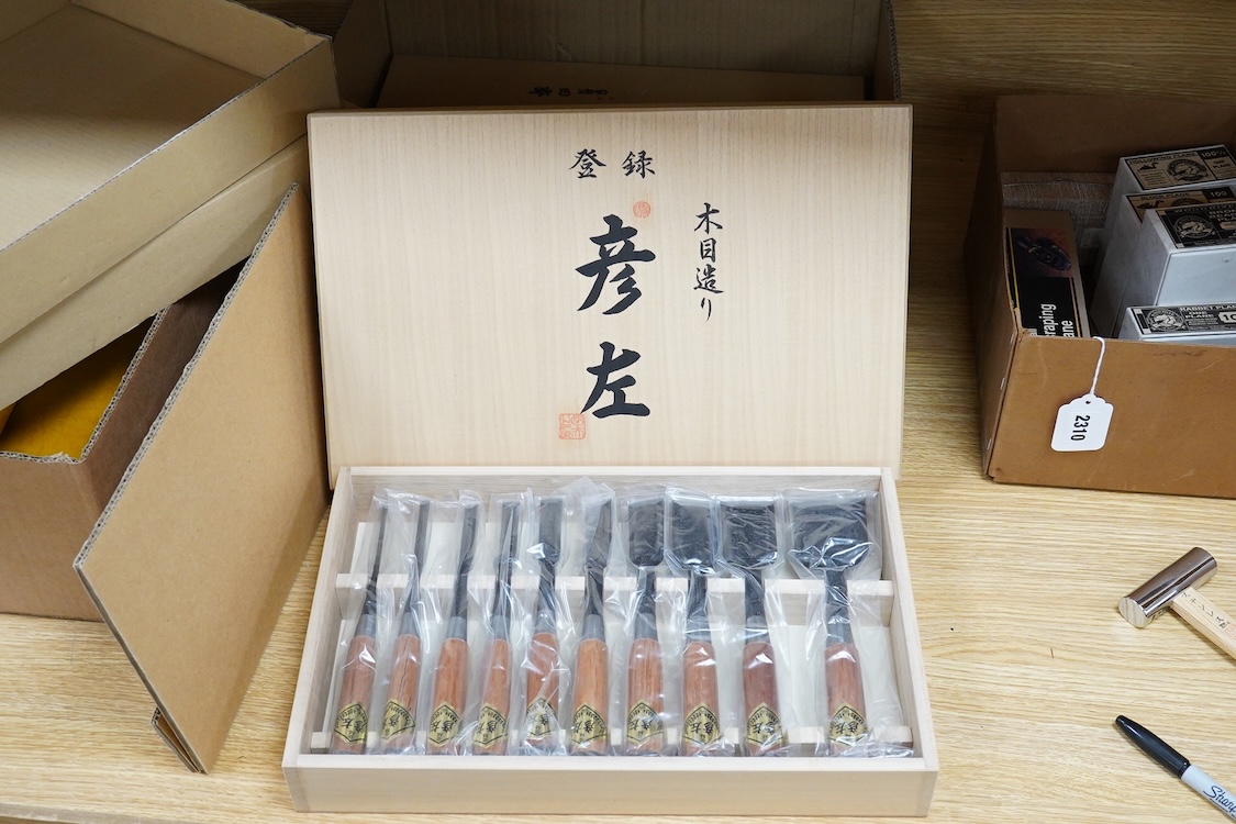 Lot 2309 , Two wood cased Japanese woodworking chisel sets, a timber framing set of five chisels and a 10 piece set of smaller chisels, both in fitted boxes, together with three small Japanese hammers