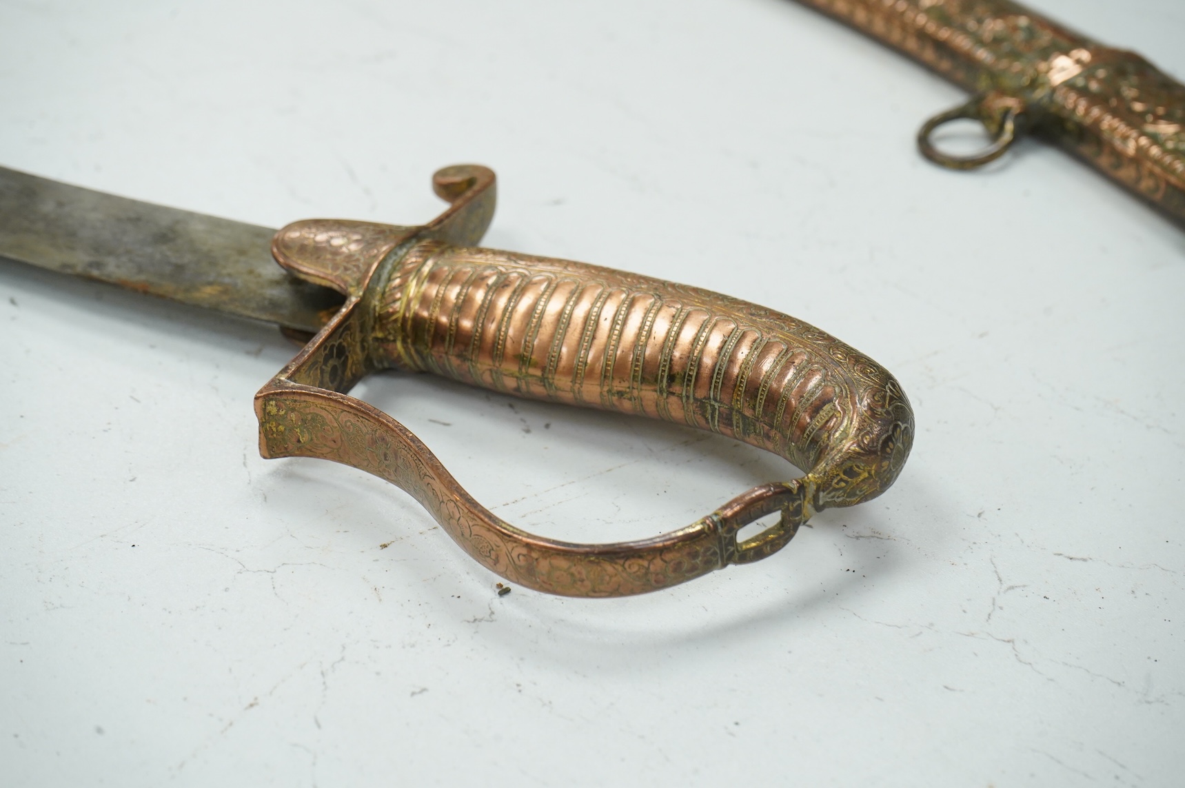An early 19th century Indian sabre with curved single edge blade, copper grip and stirrup hilt, in its copper scabbard embossed with lions, scrolling foliage and flowers