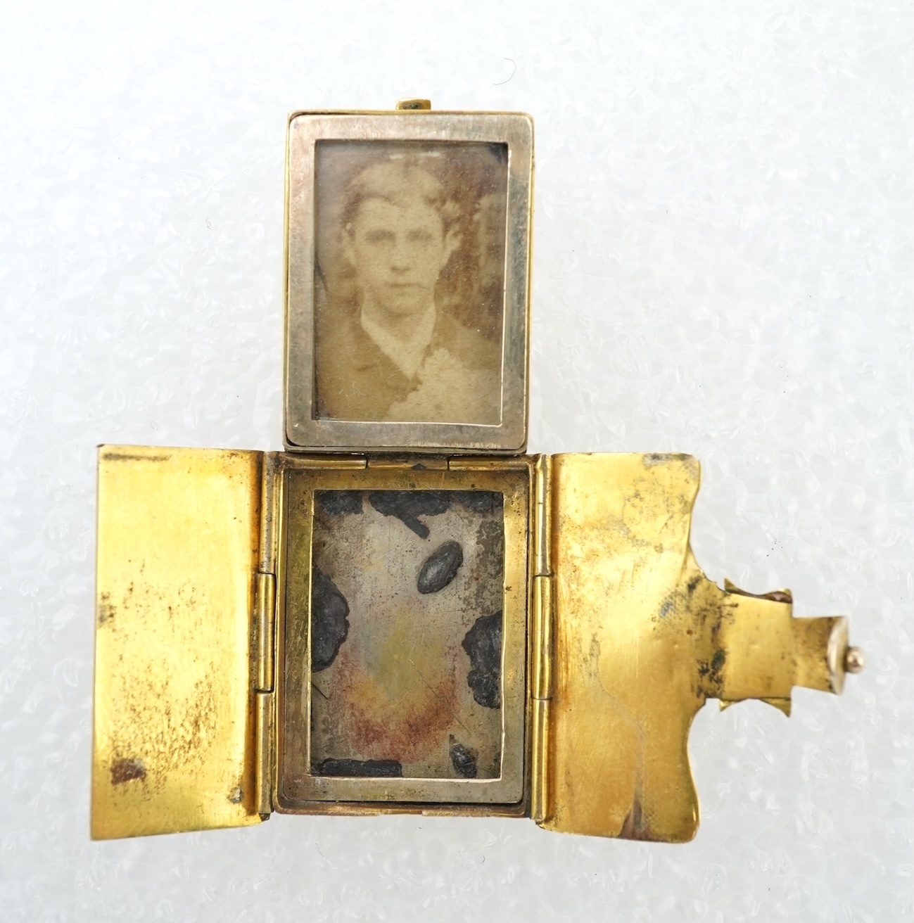 A collection of jewels, late 19th/early 20th century, comprising: a gold locket pendant designed as a Bible, with foliate scroll decoration, enclosing a hinged rectangular photograph compartment, length 2.8cm; a gold stick pin designed as a stag, length 6.3cm; a cultured pearl stickpin, length 6.2cm; a gold signet ring set with a shield-shaped bloodstone, opening to reveal a hidden compartment, to a band engraved with scrolled decoration, size M1/2; and a turquoise cross pendant on a gold chain, combined gross weight approximately 17 grams