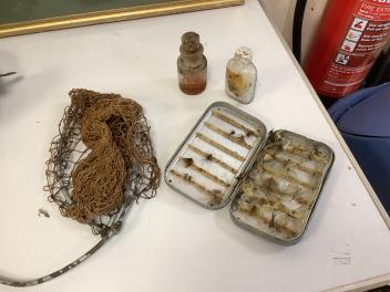 A collection of split cane fishing rods, reels, landing net etc contained in a large wooden box