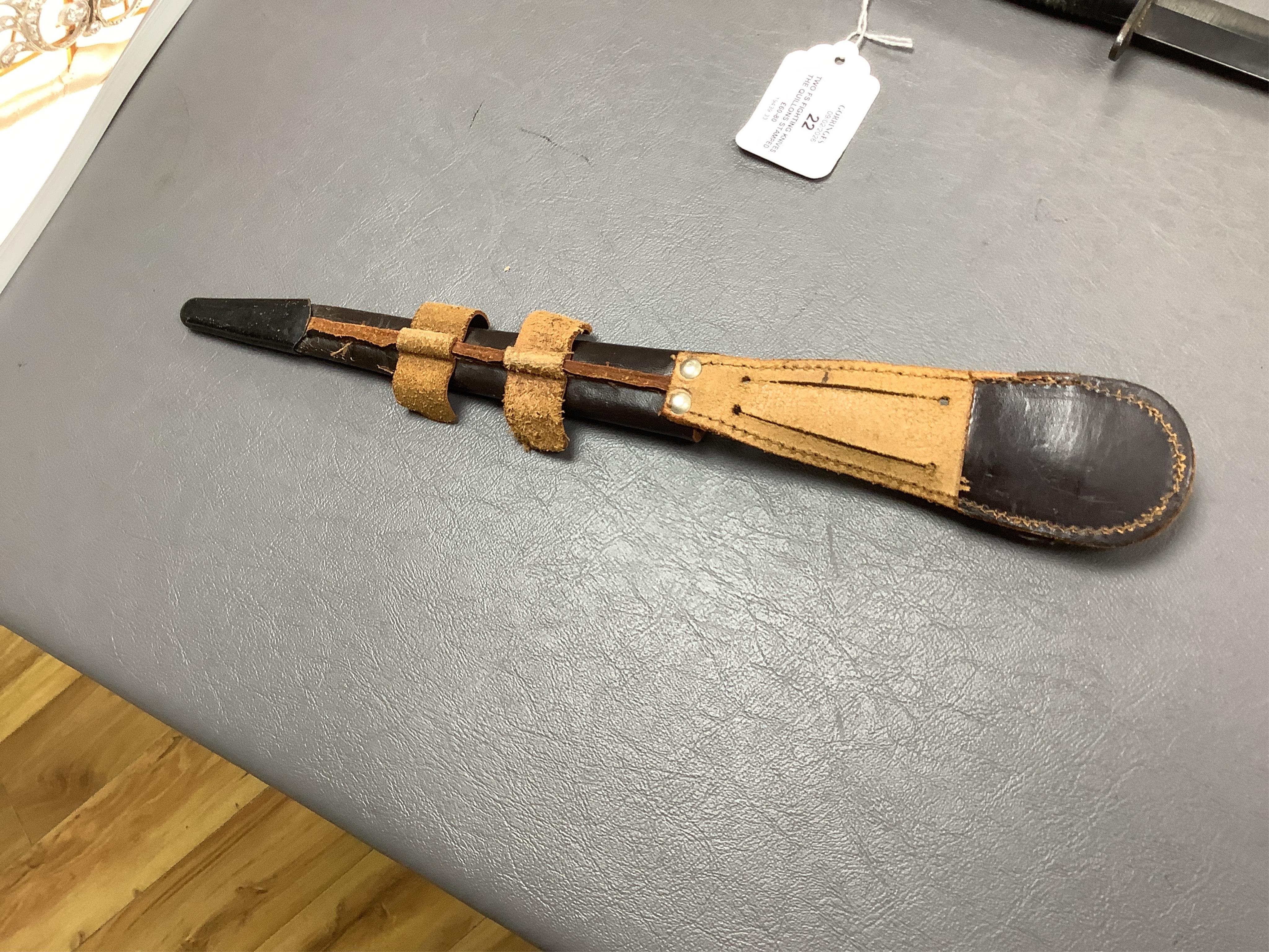 Lot 22 , Two Fairbairn Sykes fighting knives, the quillons stamped William Rogers, Sheffield, England in their leather sheaths