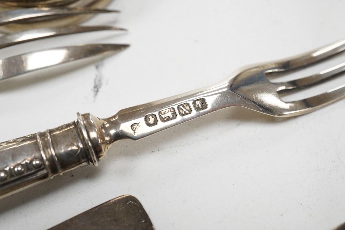 A collection of small silver and white metal items, including an Indian Hamilton & Co small dish, the centre inset with 1840 one rupee coin, one other white metal dish, two modern silver mounted napkin rings, fourteen assorted items of 19th century and later silver flatware and two silver pastry forks with loaded handles, gross 16.5oz including white metal dishes.