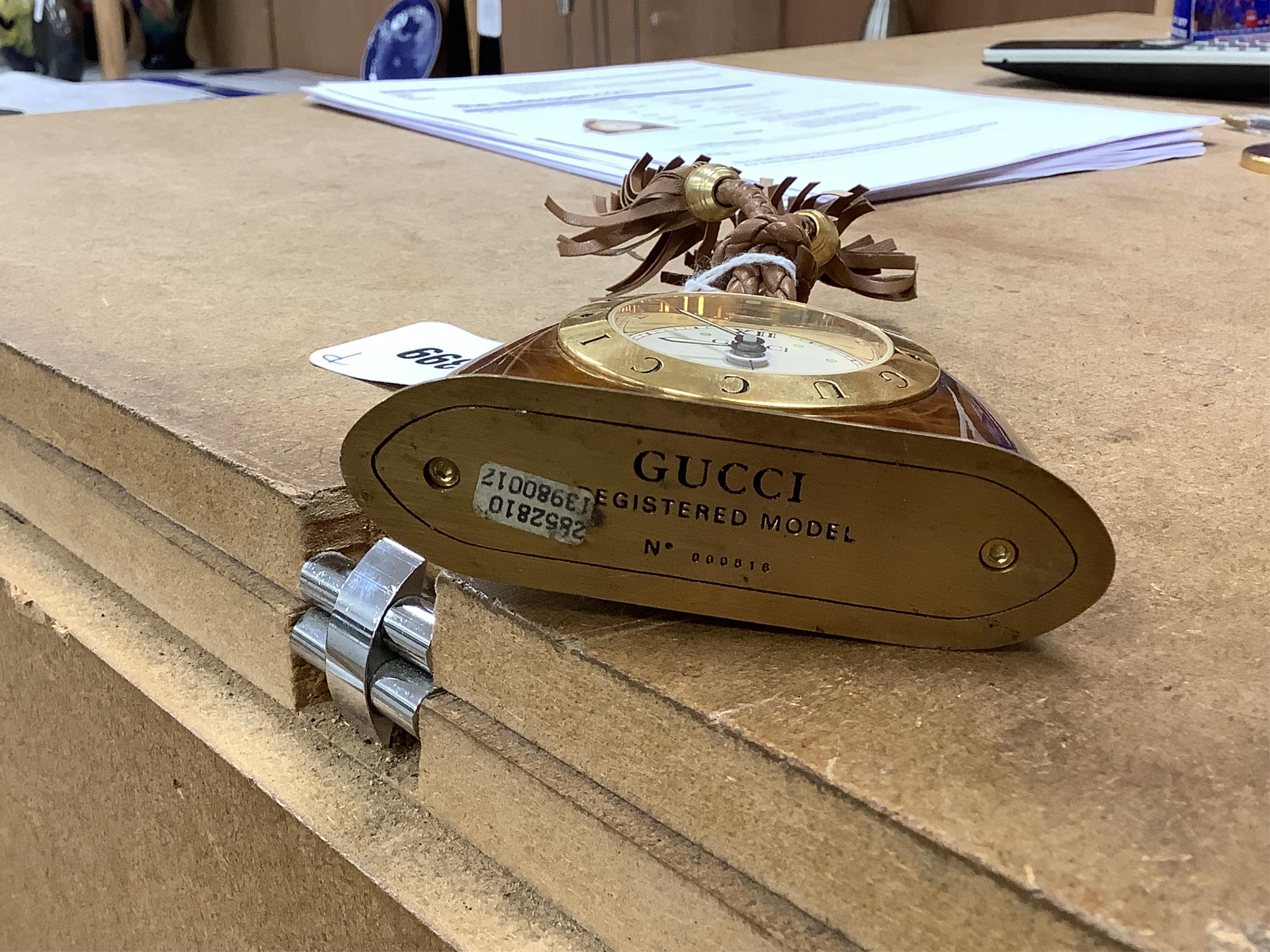 Lot 1399 , A Gucci gilt and enamelled stirrup shaped alarm clock with plaited and tasselled leather decoration, 9cm high