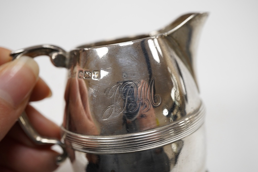 An Edwardian silver three piece bachelor's tea set, with reeded band, by Henry Stratford Ltd, Sheffield, 1909, gross weight 19oz.