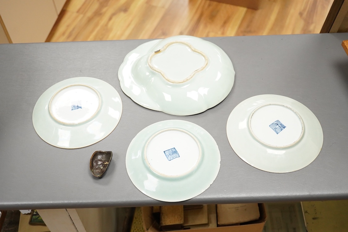 A Japanese bronze mask and four famille rose dishes - largest 29cm