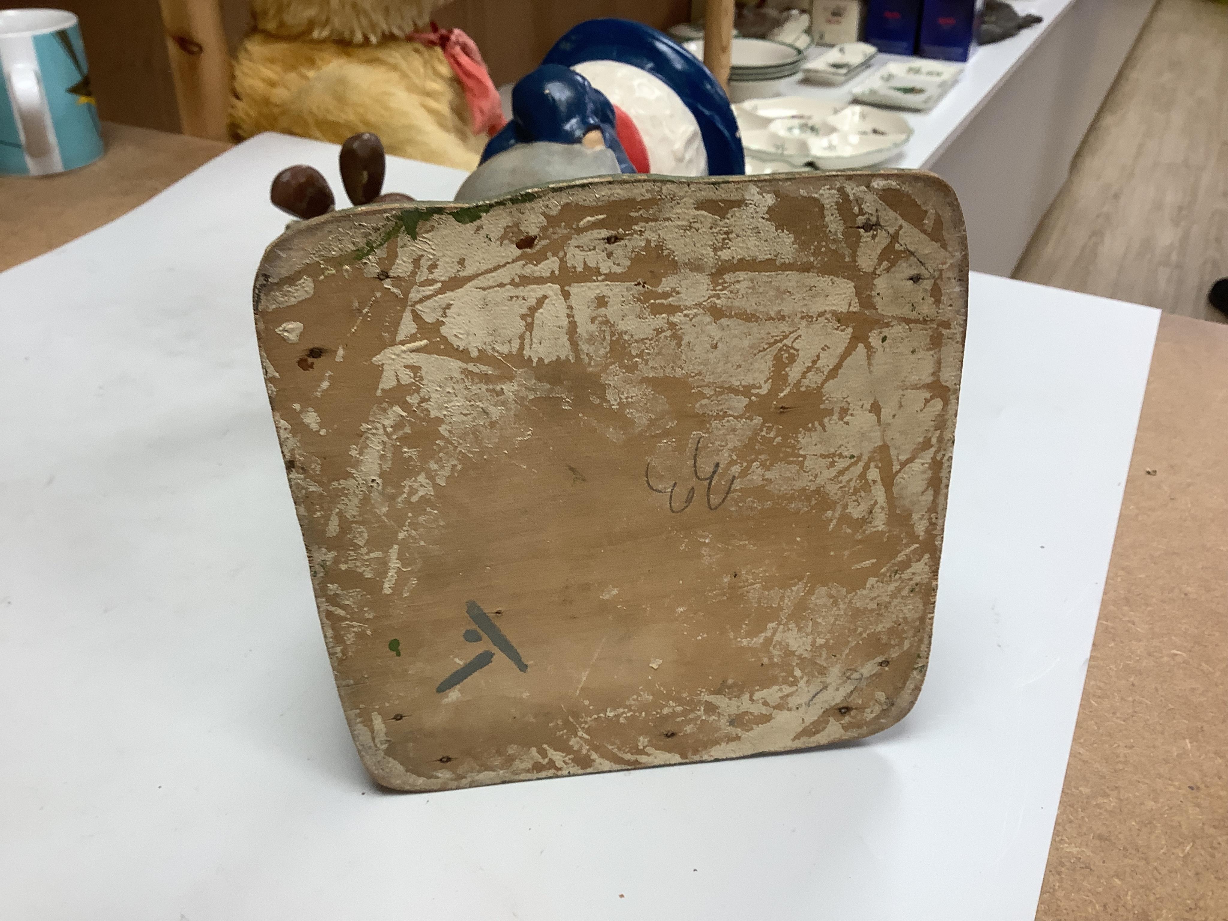 Chips to golf club-heads but clubs complete; craquelure and acceptable wear; golf-bag strap-handle torn at top; a crack to each ankle. Believed to date to the 1930’s, not a replica. Approx. 1.4kg in weight.