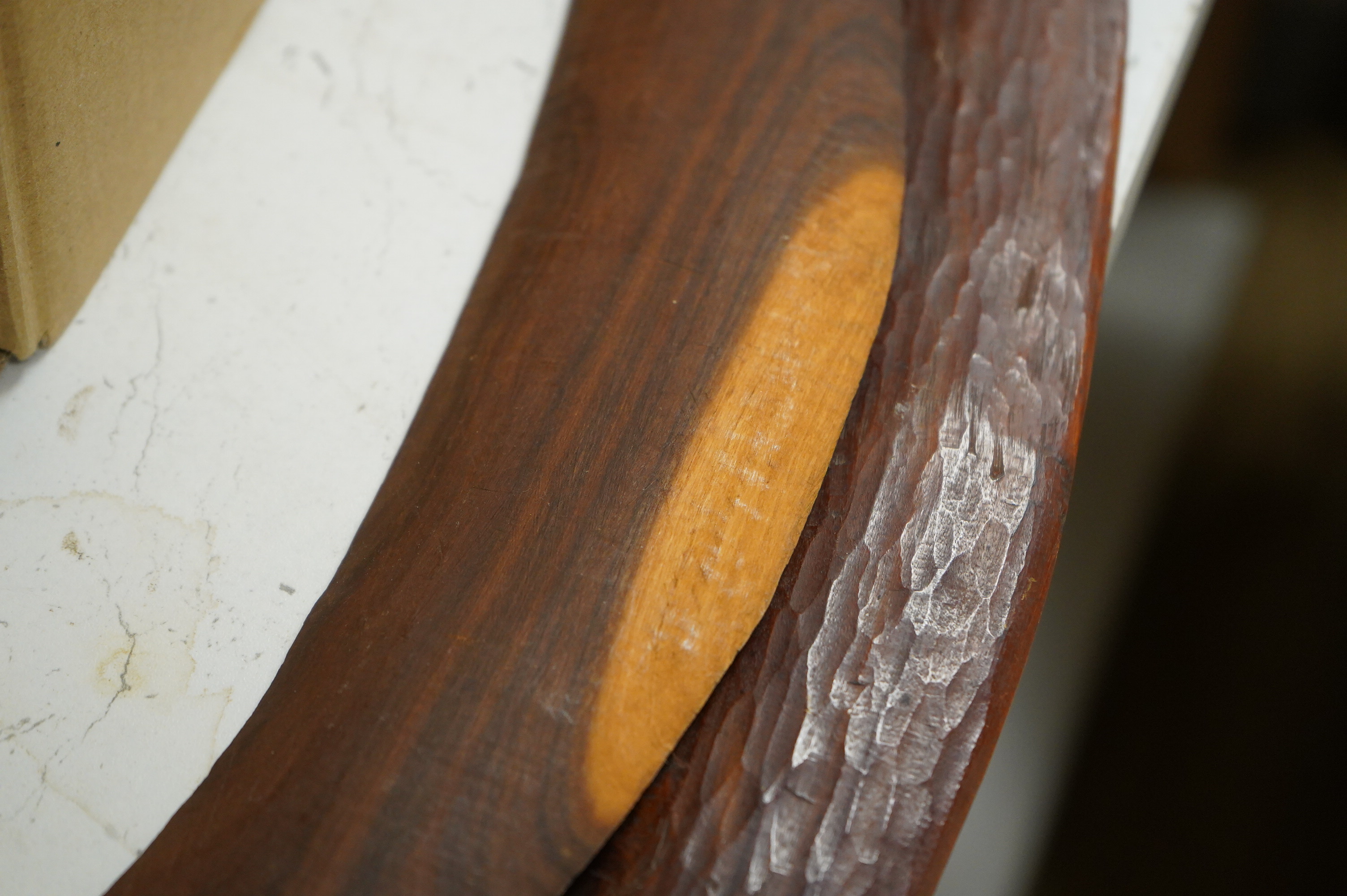Five ethnographic items; an early 20th century chip carved Australian boomerang-60cm long , together with a later example, a Benin bonds of a warrior seated on a stool, a Makonde African carved figure group and an African carved wood mask,
