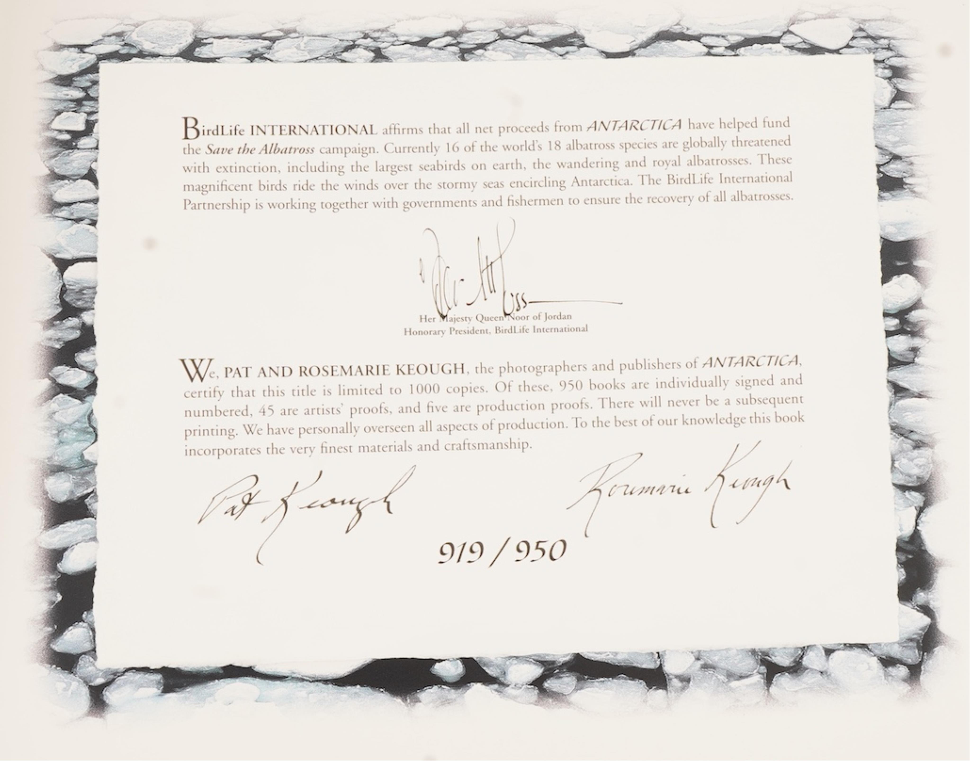 ° Keough, Pat and Rosemary. Antarctica. Explorer Series, Volume 1. Limited Edition of 950 numbered copies signed by the authors and Queen Noor of Jordan. illus. 330 full photographic illustrations and 15 duotones. 336p. original grey goatskin binding by Felton bookbinding, velvet pastedowns and f. f.e.ps. linen and velvet lined archival box with gloves and publisher's ephemera, a signed certificate of limitation to p.1. large oblong 4to. British Columbia: Nahanni Productions, 2002.
