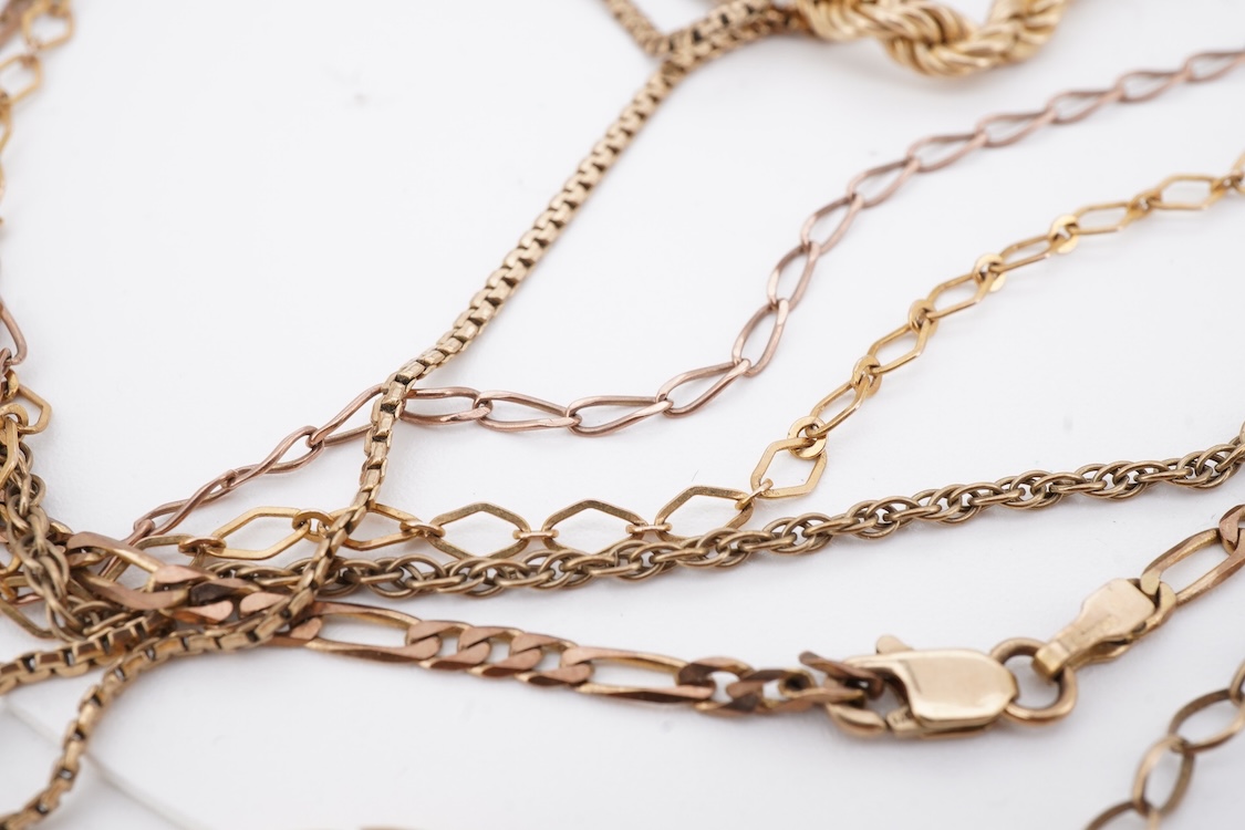 Lot 918 , A collection of gold jewels, comprising: six 9ct gold chains and one bracelet, each with British hallmarks, total gross weight approximately 19.5 grams; a gold necklace, gross weight approximately 2 grams; a single earri