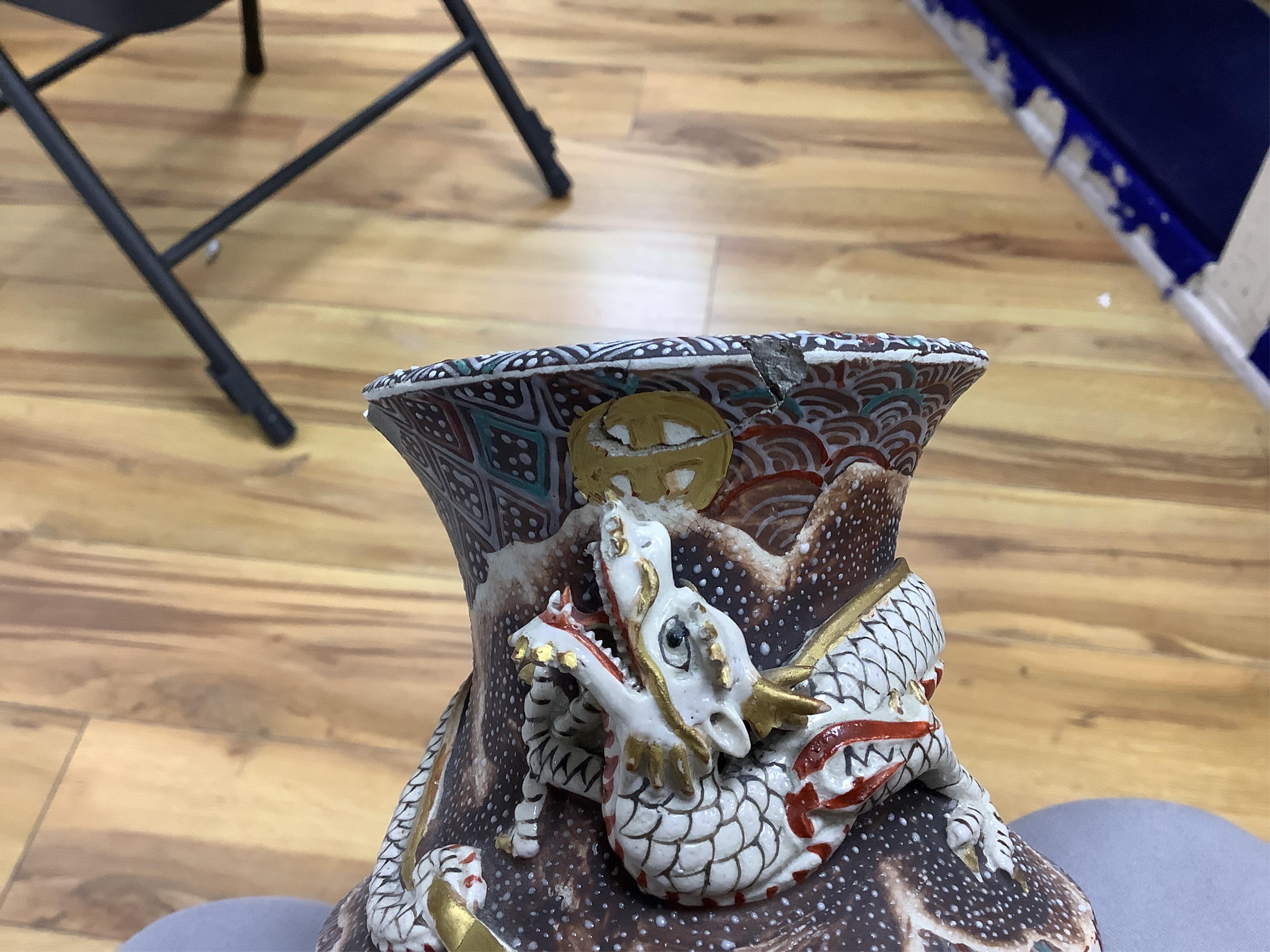 Lot 255 , A pair of Japanese Satsuma ‘warrior’ vases, Meiji period, each neck modelled with a dragon, 31cm high