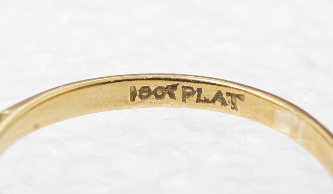 A three-stone diamond ring, claw-set with three brilliant-cut diamonds totalling approximately 1.25 carats, mounted in gold and platinum, size M, stamped 18CT PLAT, gross weight approximately 3 grams