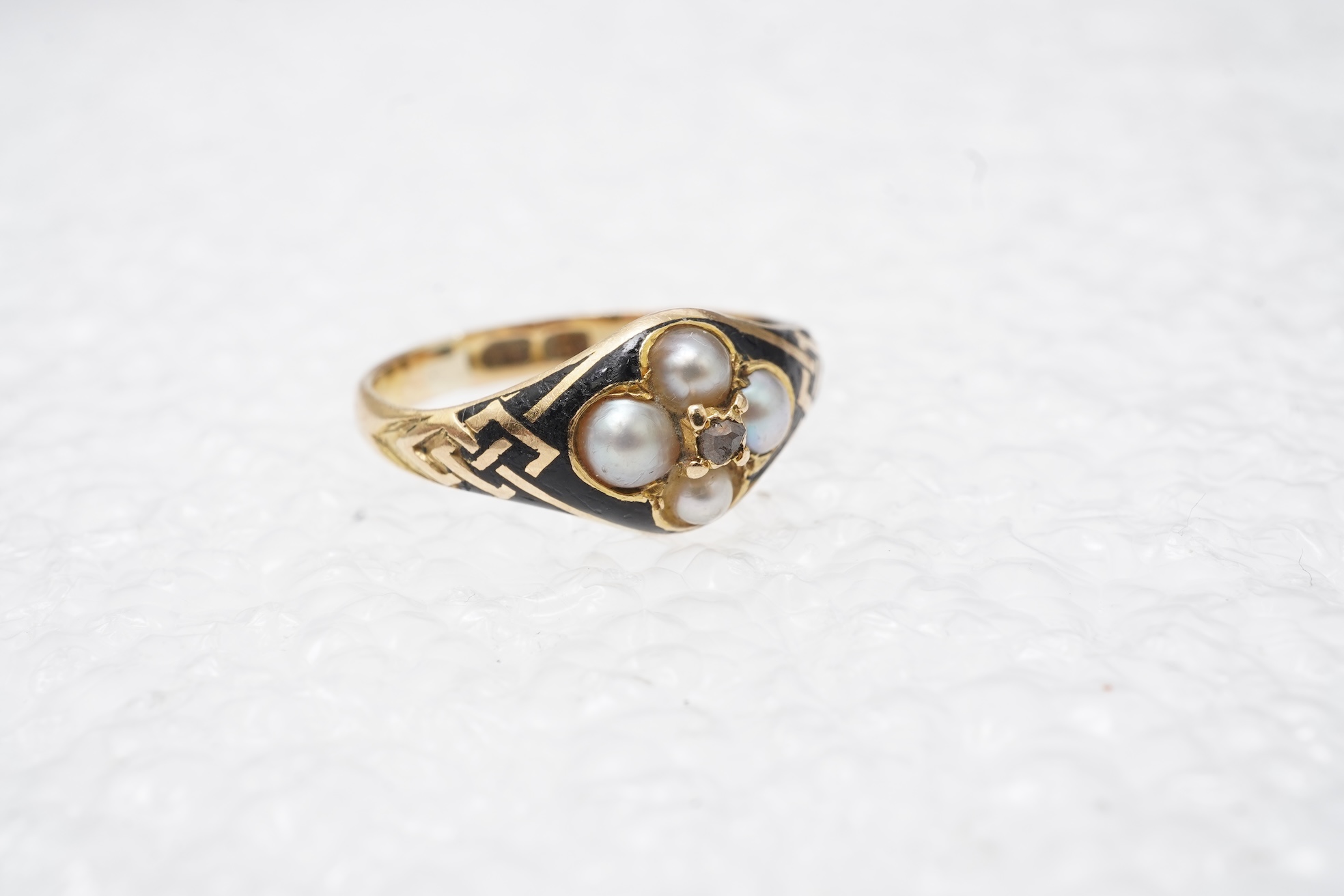 A Victorian pearl and enamel mourning ring, late 19th century, centring on a cluster of four split pearls around a rose-cut diamond, to a band applied with black enamel, the shoulders with knot motifs, mounted in gold, size F, stamped 18, gross weight approximately 2 grams, pearls untested