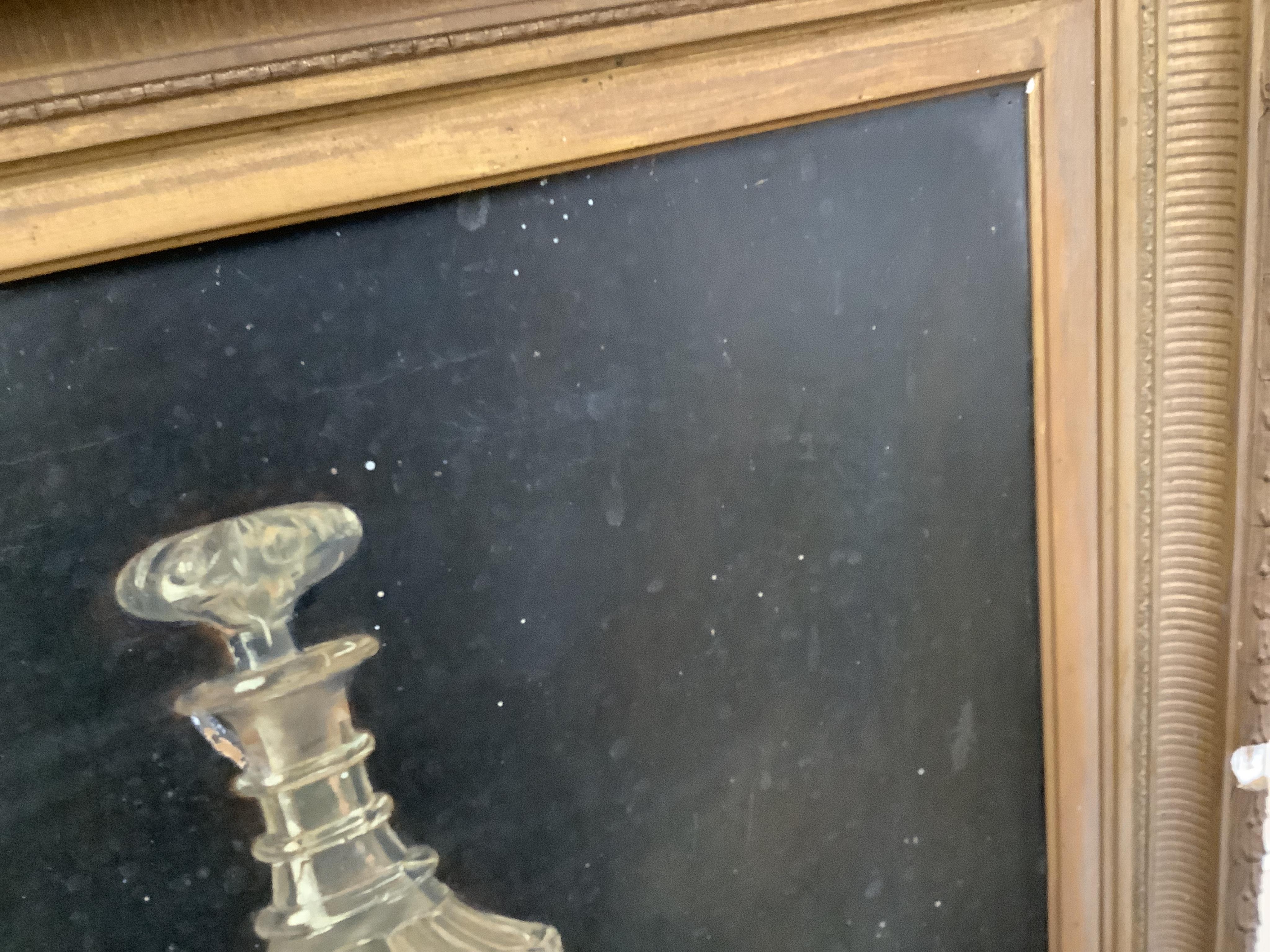 Canvas dirty with a series of white spots clearly visible against the dark ground; hand-written label verso; signed lower-right and, less clearly, lower-left. Frame with a series of missing sections.