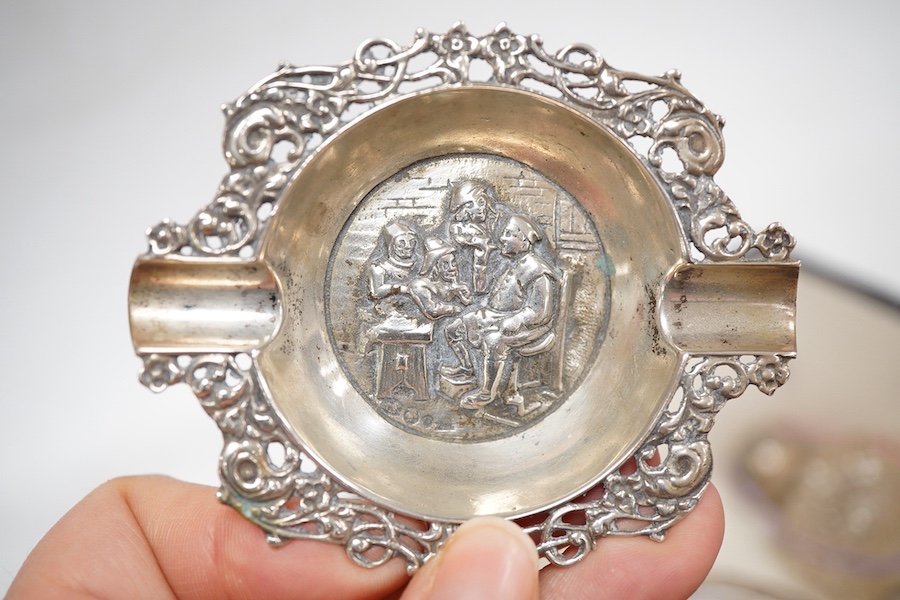 A group of collectable small silver, to include an Edwardian silver butter shell, 95mm, an Edwardian silver bowl by James Dixon & Sons, with a ceramic flower spreader insert, three silver mounted glass toilet jars, together with three Dutch white meta ashtrays, and two metal matchbox sleeves.