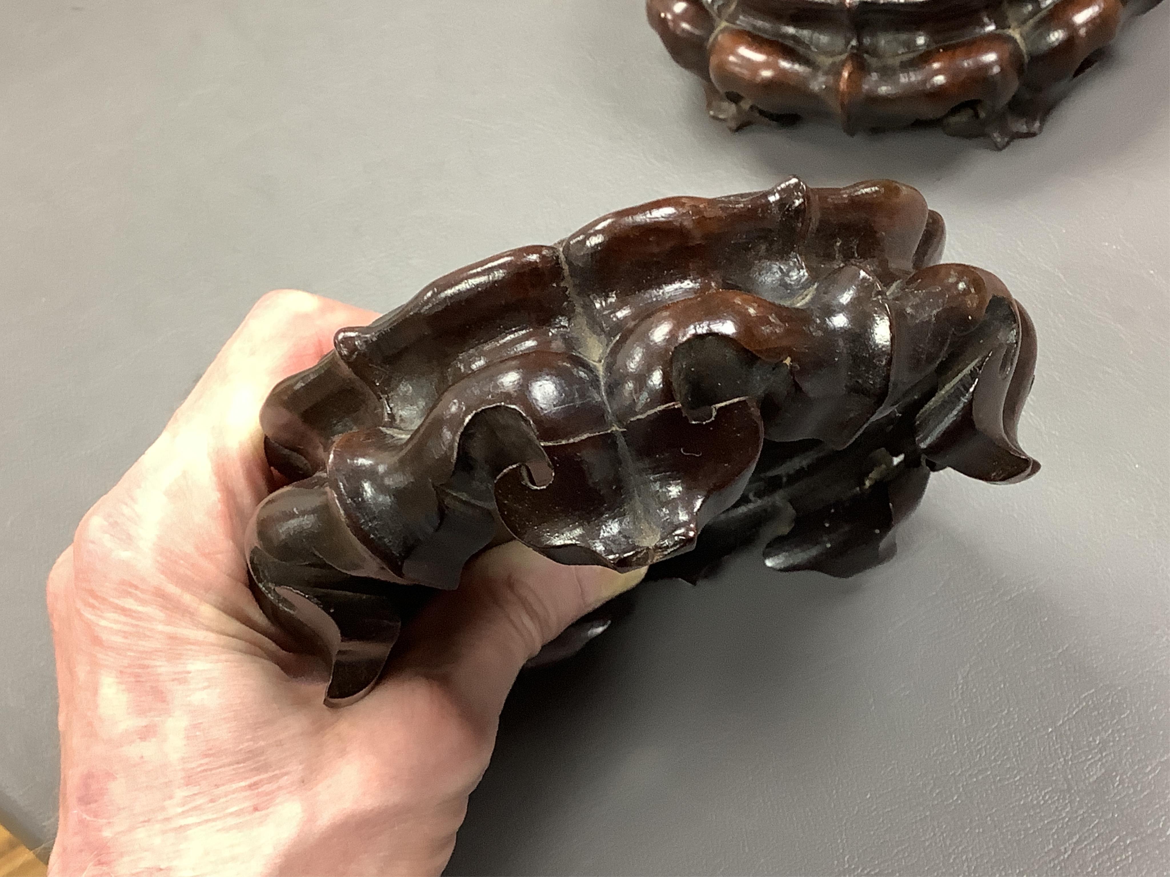 One vase deep v-shape chip to neckrim and crack issuing downward from this reaching shoulder, image 4; further more serious crack alongside, clearly visible, image 6; other vase good. One cover Buddhistic lion tail chipped, image 7; shallow chip to rim; other cover good. Stands deceptively heavy; one stand foot glue re-attached, image 8; other stand small, old chip to rim, image 9; both with acceptable signs of wear.