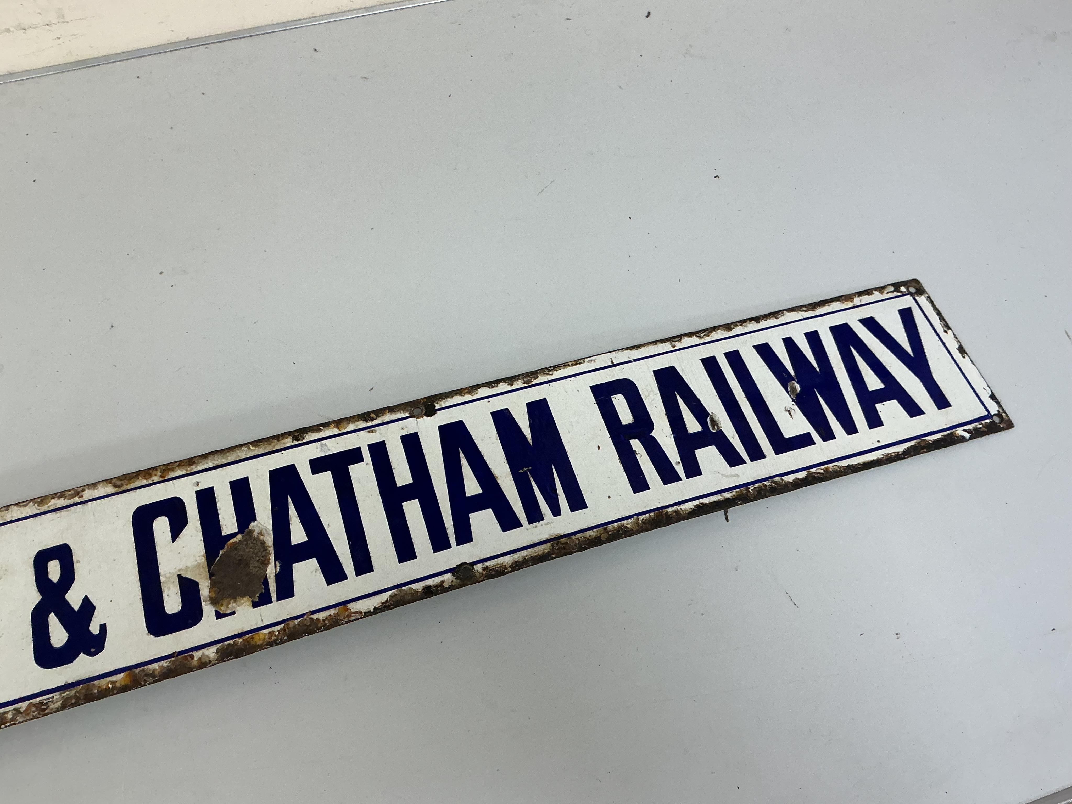 A SE&CR quad royal enamel station poster board heading; SOUTH EASTERN & CHATHAM RAILWAY, blue lettering on white ground, 105cm wide