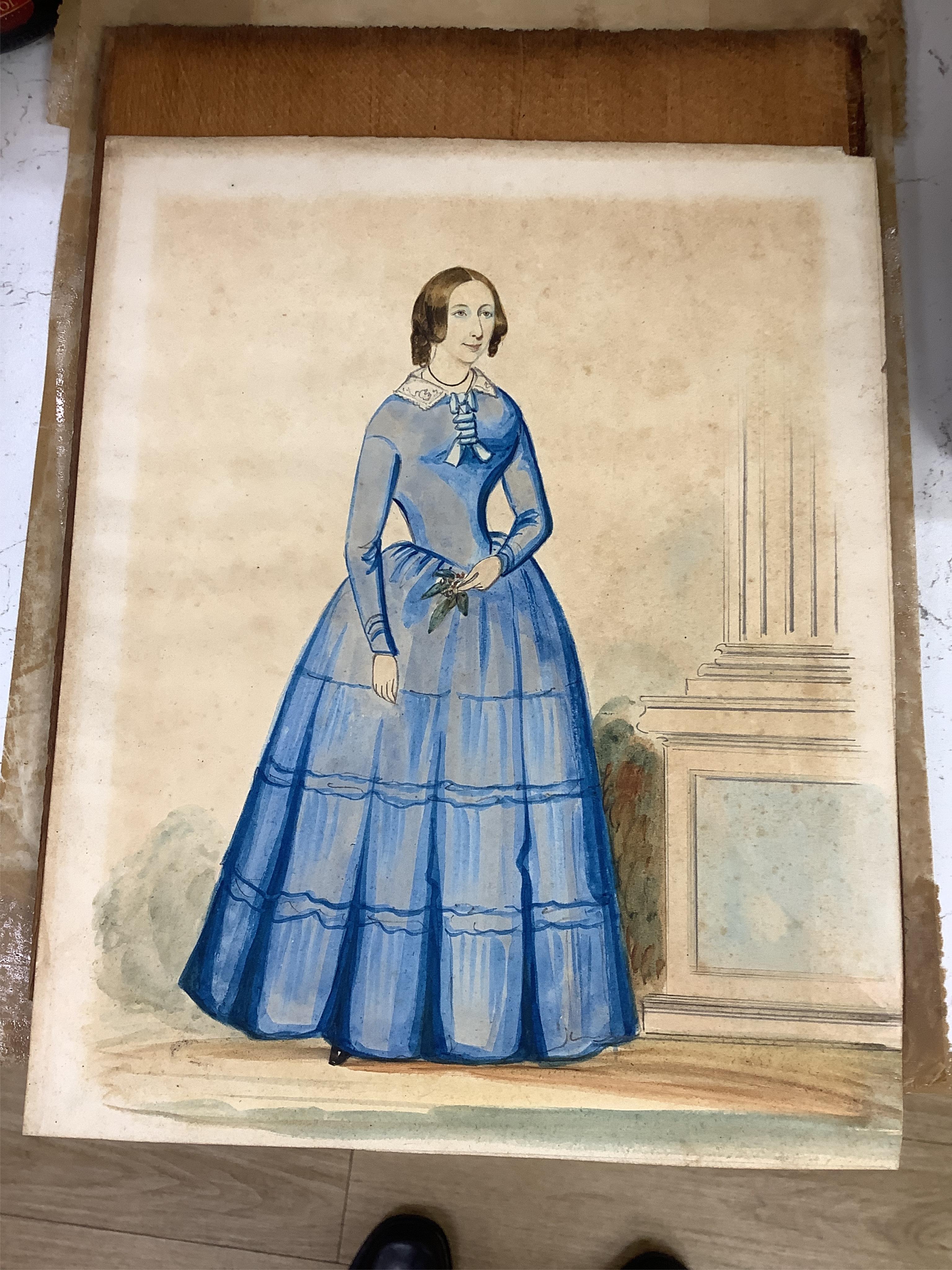 Regency school, portrait of a young child before drapery, watercolour, together with an early Victorian school full length portrait of a lady, largest 25 x 22cm
