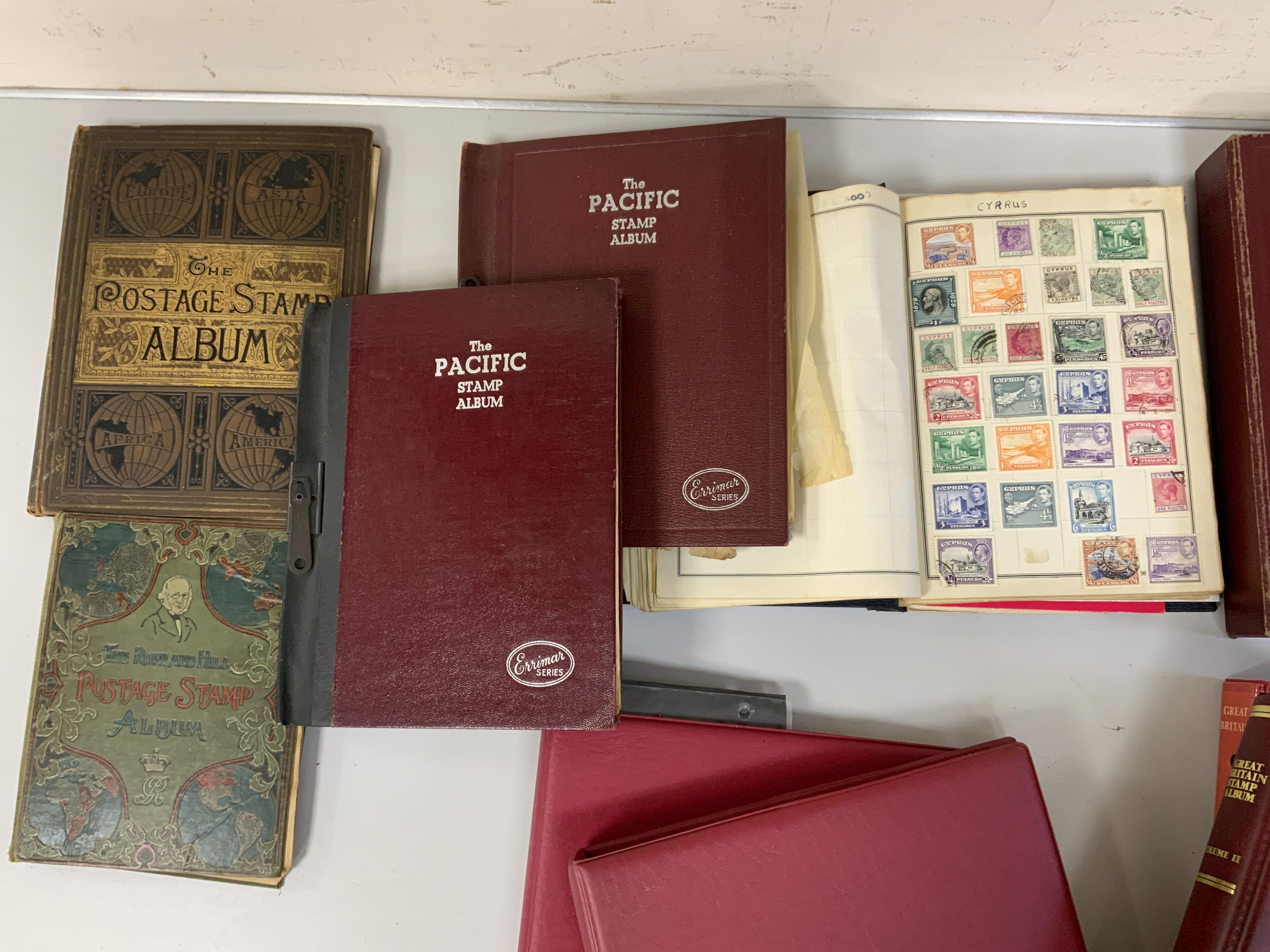A collection of Great Britain and World postage stamps contained within ten stamp albums, including incomplete Stanley Gibbons dedicated Great Britain stamp albums containing; two One Penny black stamps, early One Penny reds and Two Pence blue stamps, plus a number of other Victoria and Edward VII examples, other albums include unused Elizabeth II stamps and sets, plus earlier albums of world stamps
