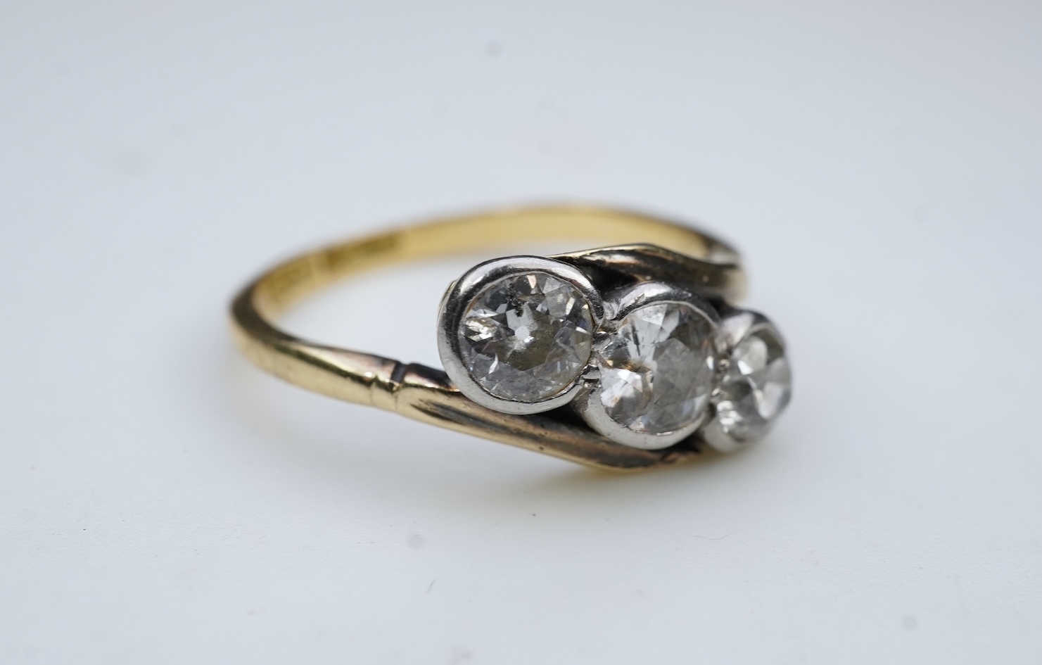 A three-stone diamond ring, early 20th century, collet-set with three circular-cut diamonds totalling approximately 0.70 carats, set diagonally to a gold band, mounted in gold and platinum, size K, stamped 18CT PLAT, gross weight approximately 2.5 grams