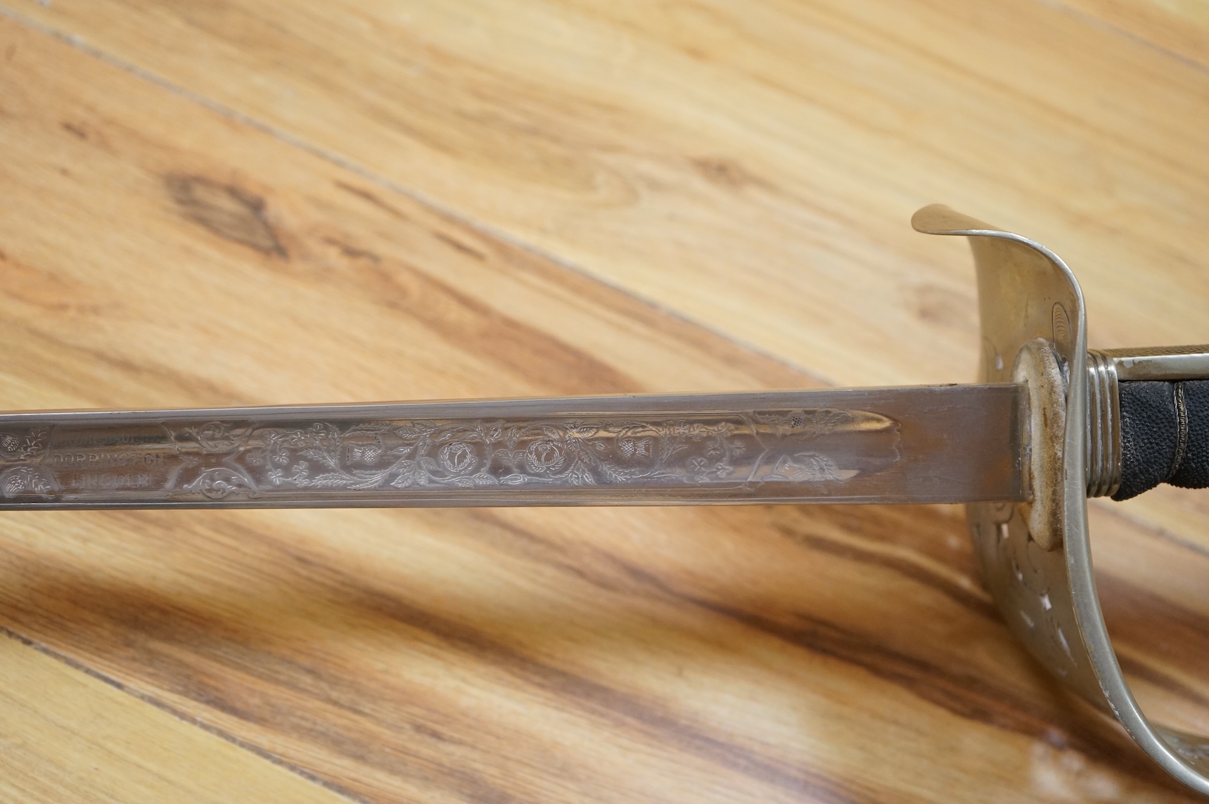 Lot 282 , A George V 1897 pattern infantry officer’s sword, with regulation blade etched with the union flowers, Royal Arms and owners name; J.W. Reynolds, Dorrington, Lincoln, regulation nickel guard stamped ‘WH&S’ in minuscules,