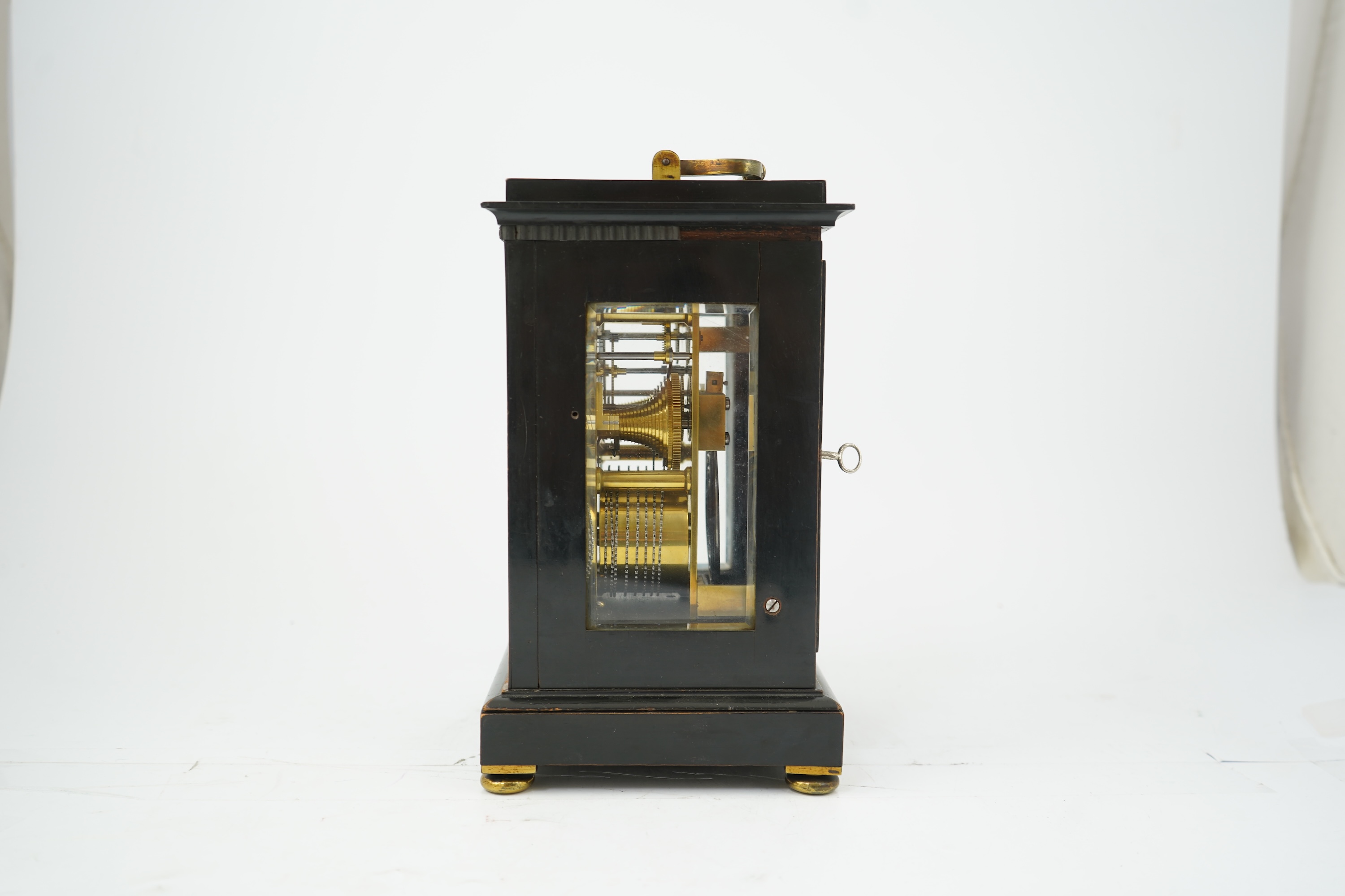 A mid-19th century ebonised double fusee mantel clock by Jacobs and Lucas, 7, Whitefriargate, Hull, silvered dial with Roman numerals, bevelled glass panels to the top and sides and brass carrying handle above, steel fretwork to rear door and brass feet, eight day movement with platform escapement and signed backplate, striking on a coiled gong, 28cm high
