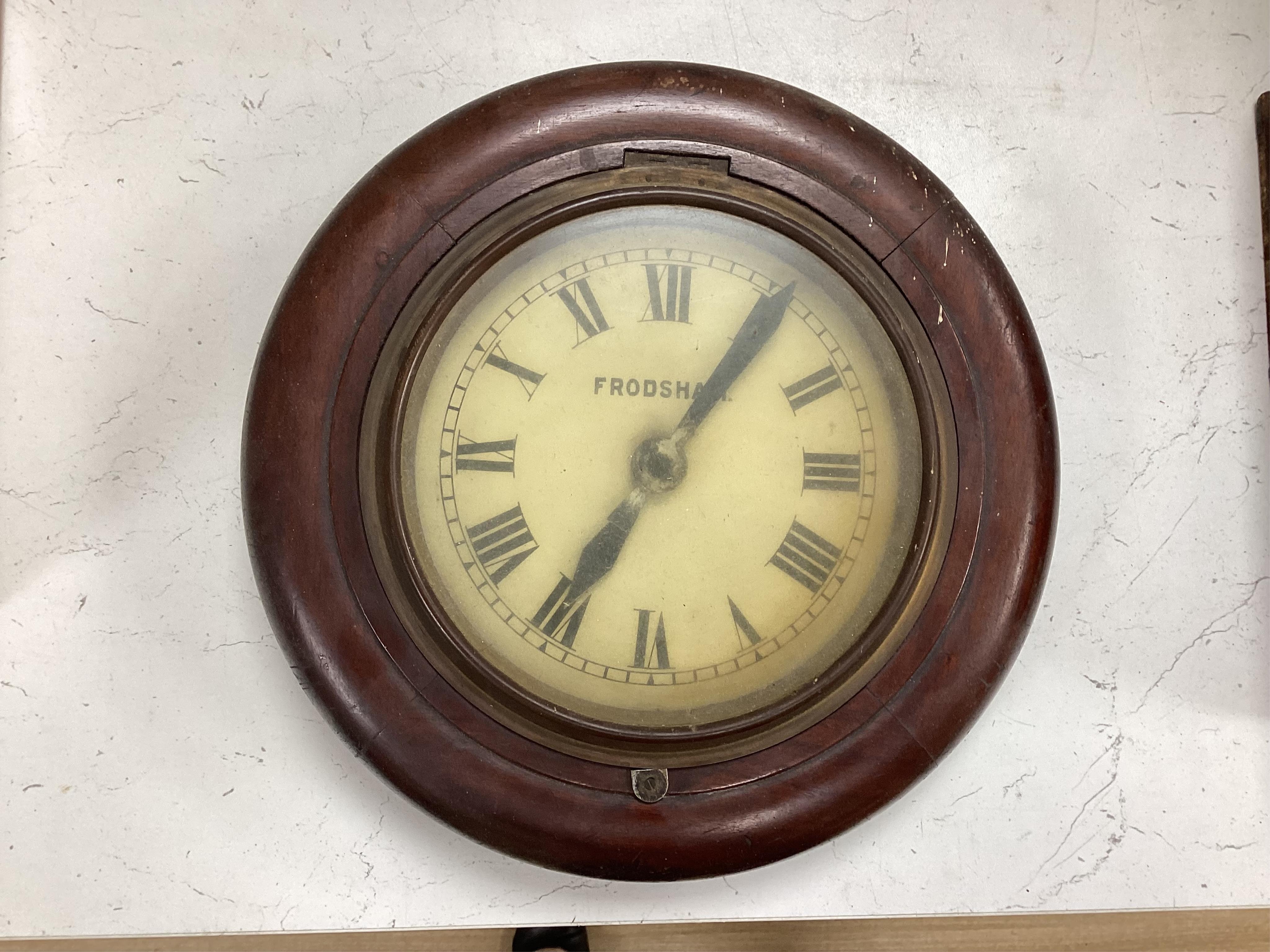 A Hutton, Sheffield English Pewter tea set comprising a teapot, 8cm high, jug and sugar bowl, together with salt and pepper shakers by other makers, a copper coal scuttle and two American mesh fire screens, coal scuttle 32cm wide, and a Frodsham wall clock, 31cm